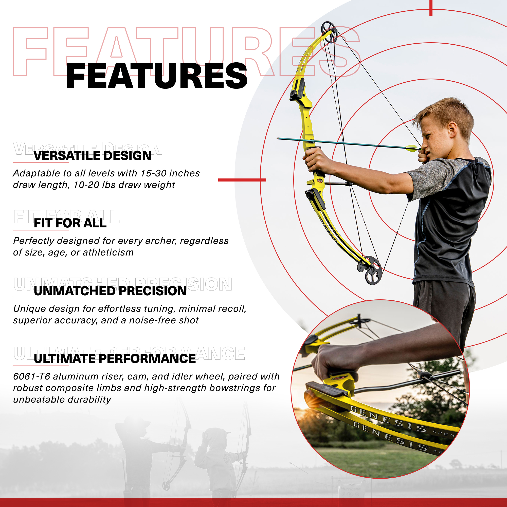 Whether you're a novice beginner or an experienced archer, the Genesis Archery Original Compound Bow and Arrow Kit is the best gateway to a new archery experience for all ages and skill levels. Feel the smoothness and precision with every shot you take.