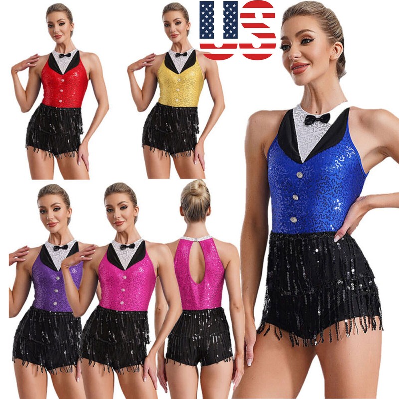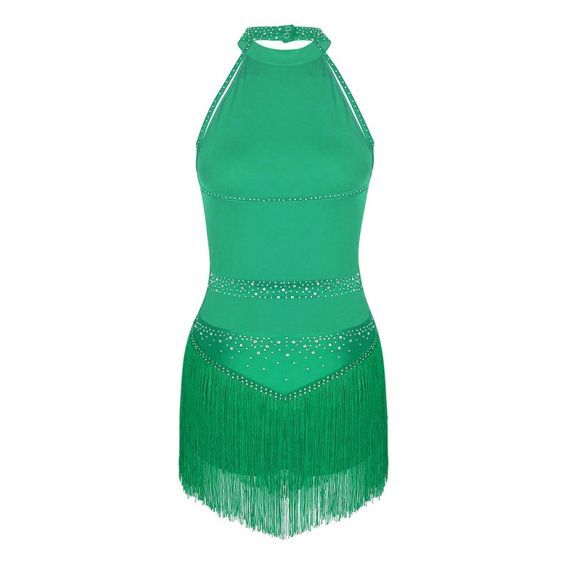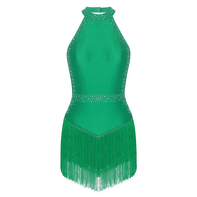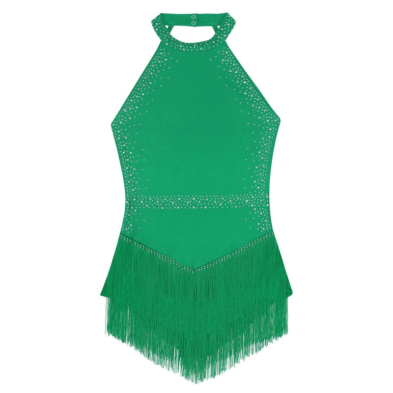 Halter sleeveless leotard tassel with rhinestones that sparkle under the light to brighten up any performance, making you more charming.