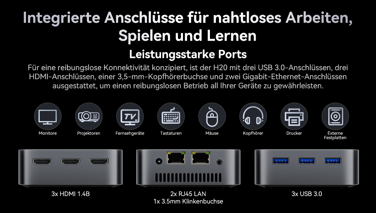 | Lieferumfang | 1 x Mini-PC 1 x Adapter (EU) 1 x HDMI-Kabel 1 x VESA-Adapter 1 x Handbuch |