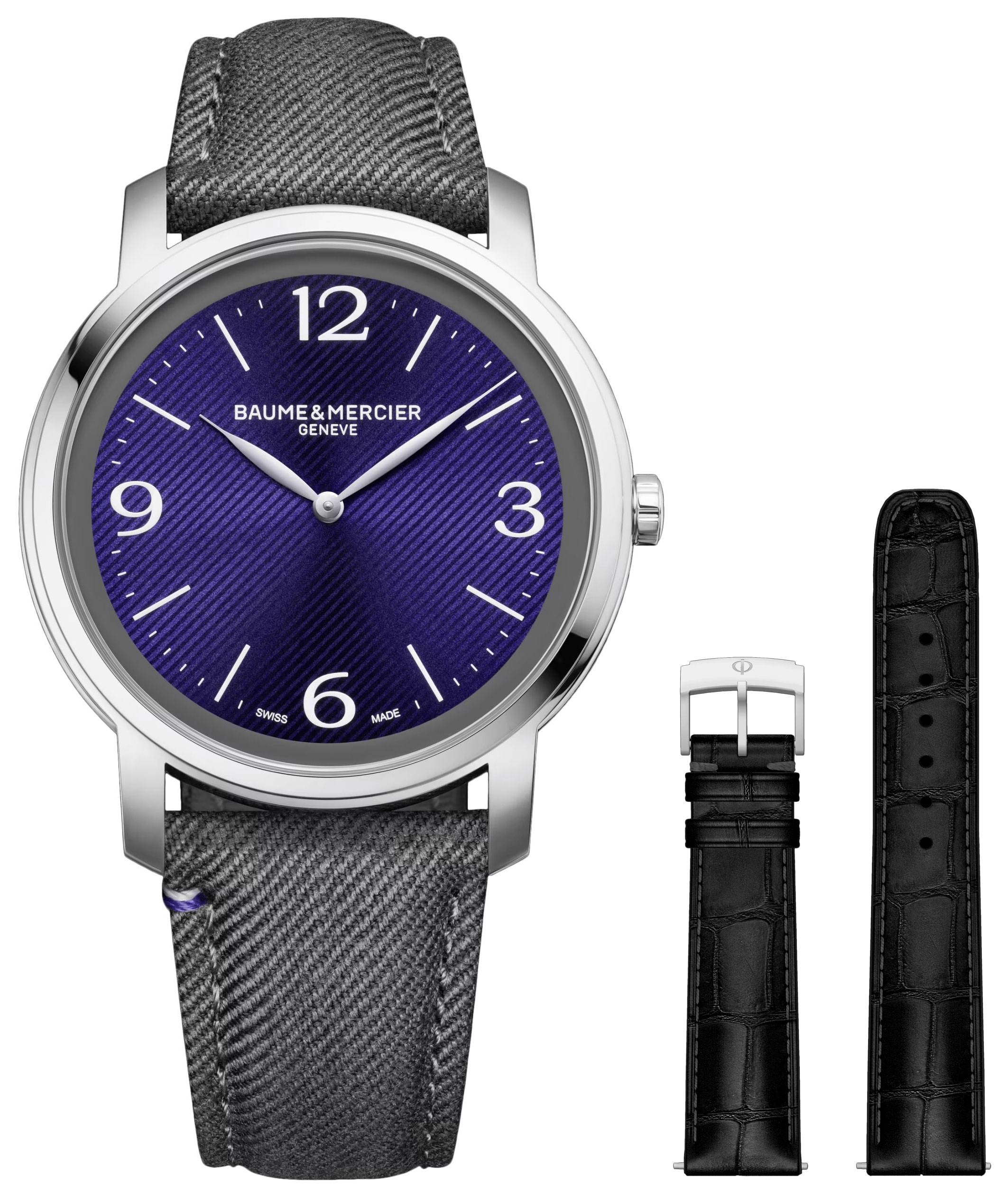 Like all of our watches, this Baume & Mercier Classima Violet Dial Gray Fabric / Black Leather Strap Quartz Mens Watch is brand new and comes in its original packaging.