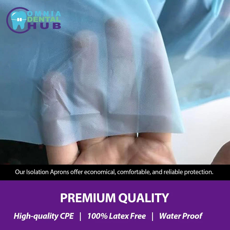 Available in packs of 10 and 100 pieces, these lab aprons come in blue color with one size (universal fit) — designed to meet professional medical and dental standards.