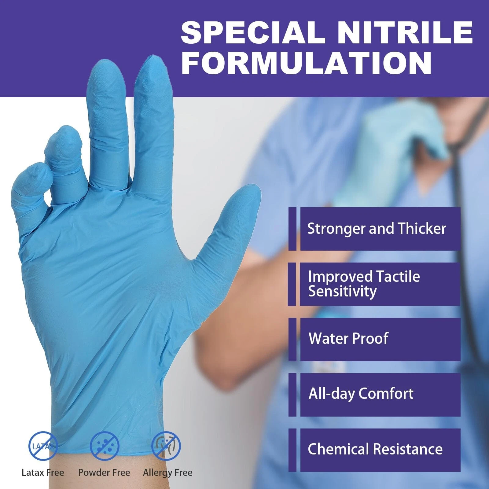 EXTRA DURABLE: These latex-free gloves are extra durable yet comfortable for your skin, with a special nitrile formulation that is stronger and thicker than regular nitrile gloves, offering improved tactile sensitivity and working great for both commercial and industrial use.