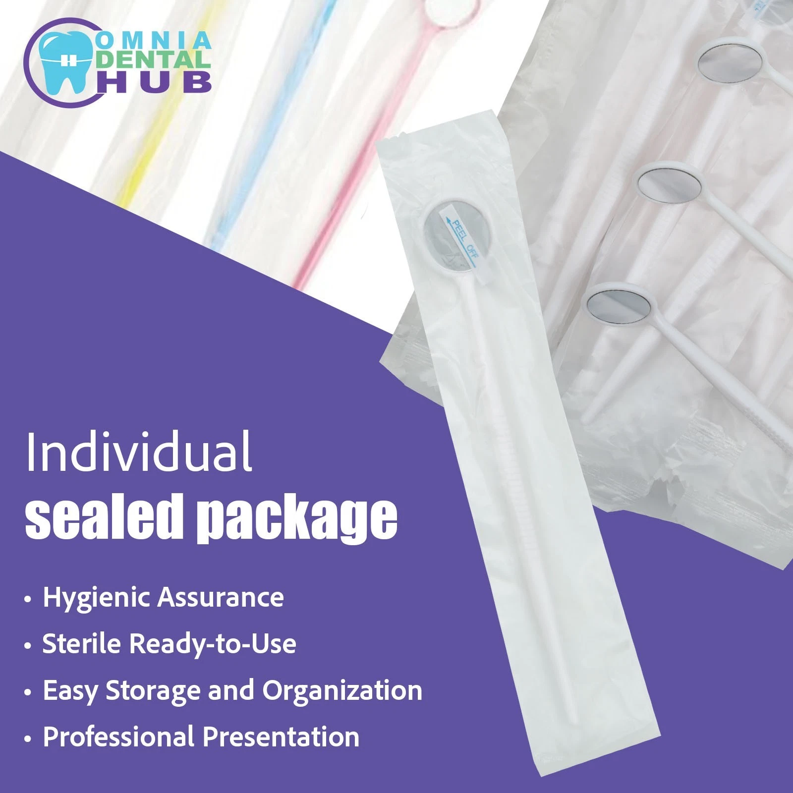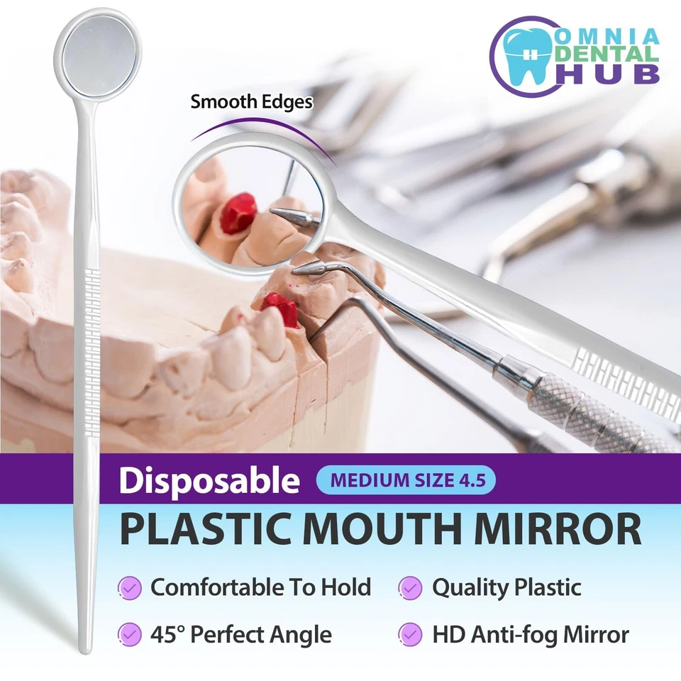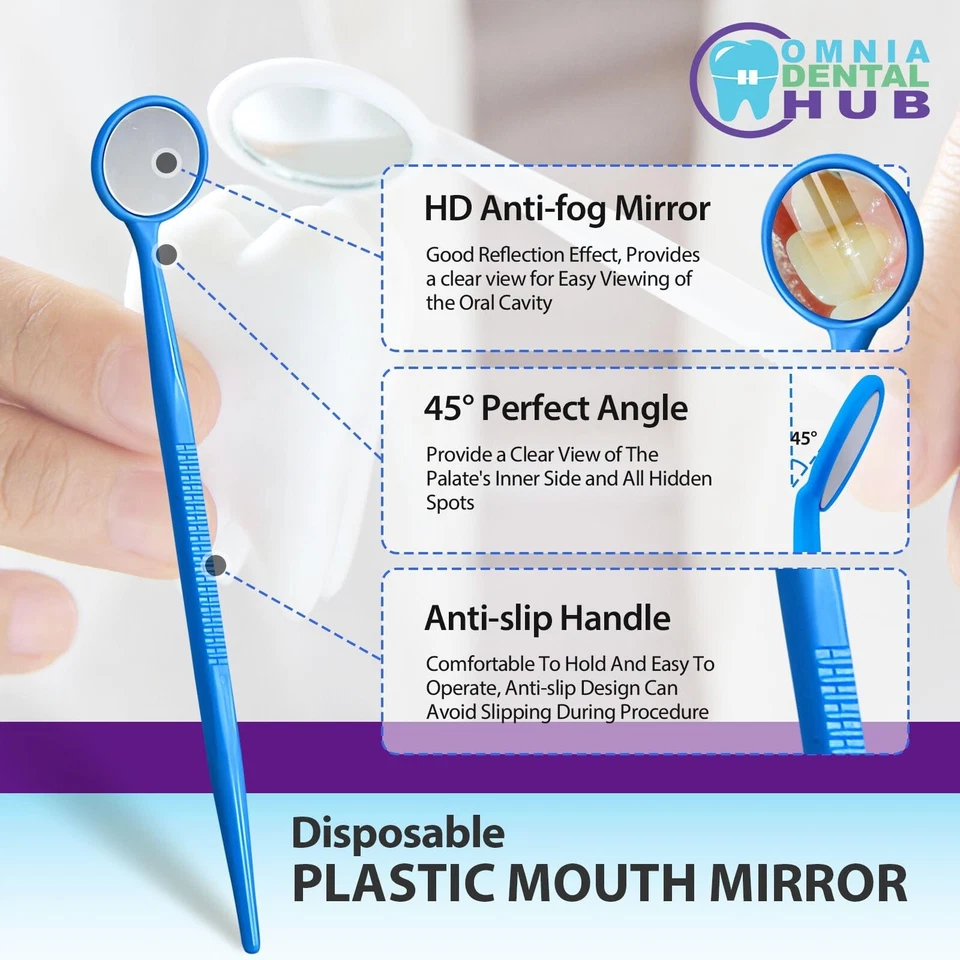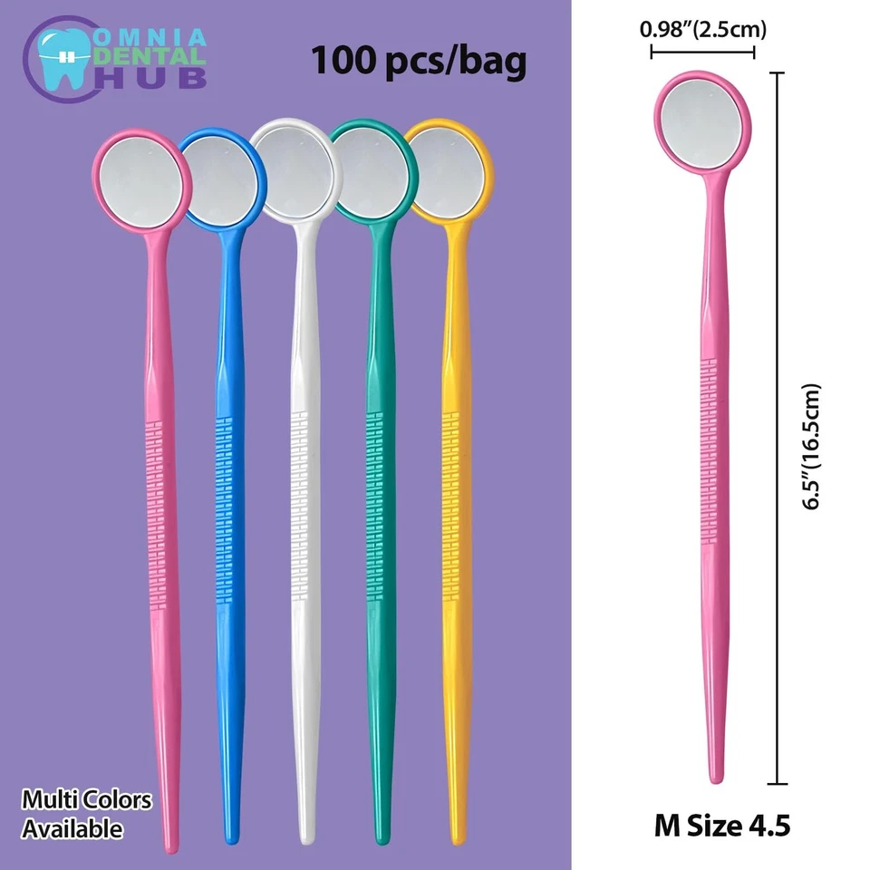 Available in packs of 100, 200 and 2000 pieces, these disposable dental mirrors come in blue, green, pink, white and yellow colors with a standard size — designed to meet professional medical and dental standards.