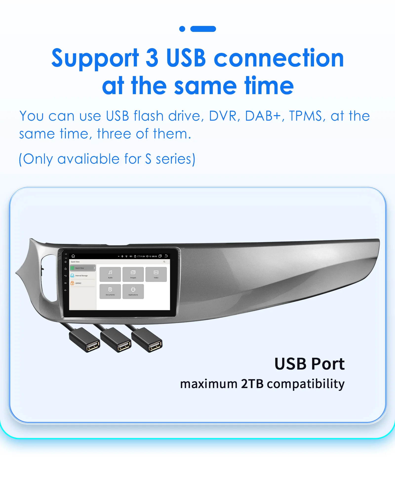 Supporta AV-OUT: scatola AV OUT (da ordinare separatamente) La serie S supporta 3 connessioni USB: memoria esterna: porta USB fino a 2 TB, questa unità può riprodurre file video e audio dal tuo dispositivo esterno. Schermo diviso: puoi utilizzare 2 app contemporaneamente (come: navigazione + musica, telecamera ADAS + musica, ecc.)