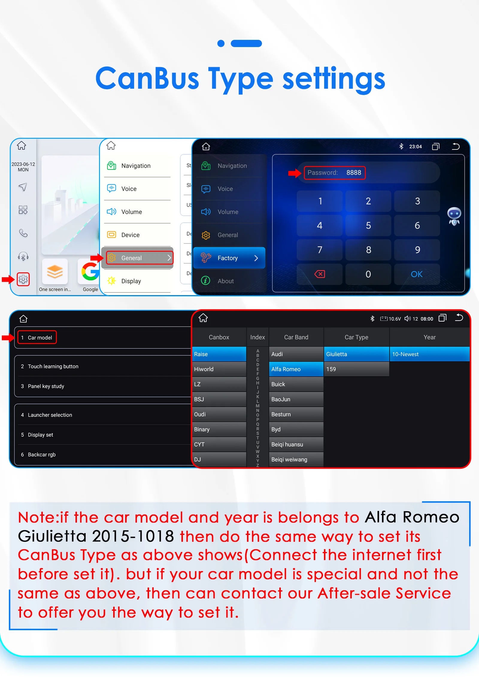 Serie S Impostazioni tipo Canbus: Fabbrica--8888(Password)--Aumenta--Alfa Romeo--Giulietta--10-Più recente--OK.