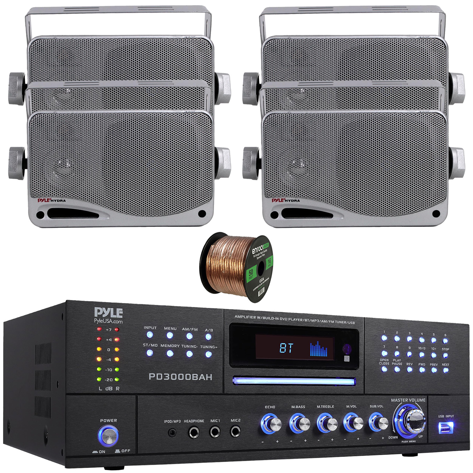 PACKAGE BUNDLE INCLUDES: Pyle PD3000BAH 4-Channel 4000W Bluetooth Home Audio Amplifier – HDMI, USB, FM Radio, CD/DVD Player, Dual Mic Inputs w/Echo, Rack Mount Karaoke Receiver, 4x Pyle PLMR24S 3.5'' 200 Watt Max Power 3-Way Weather Proof Mini Box Silver Speaker System, 50 Feet 16 Gauge Speaker Wire