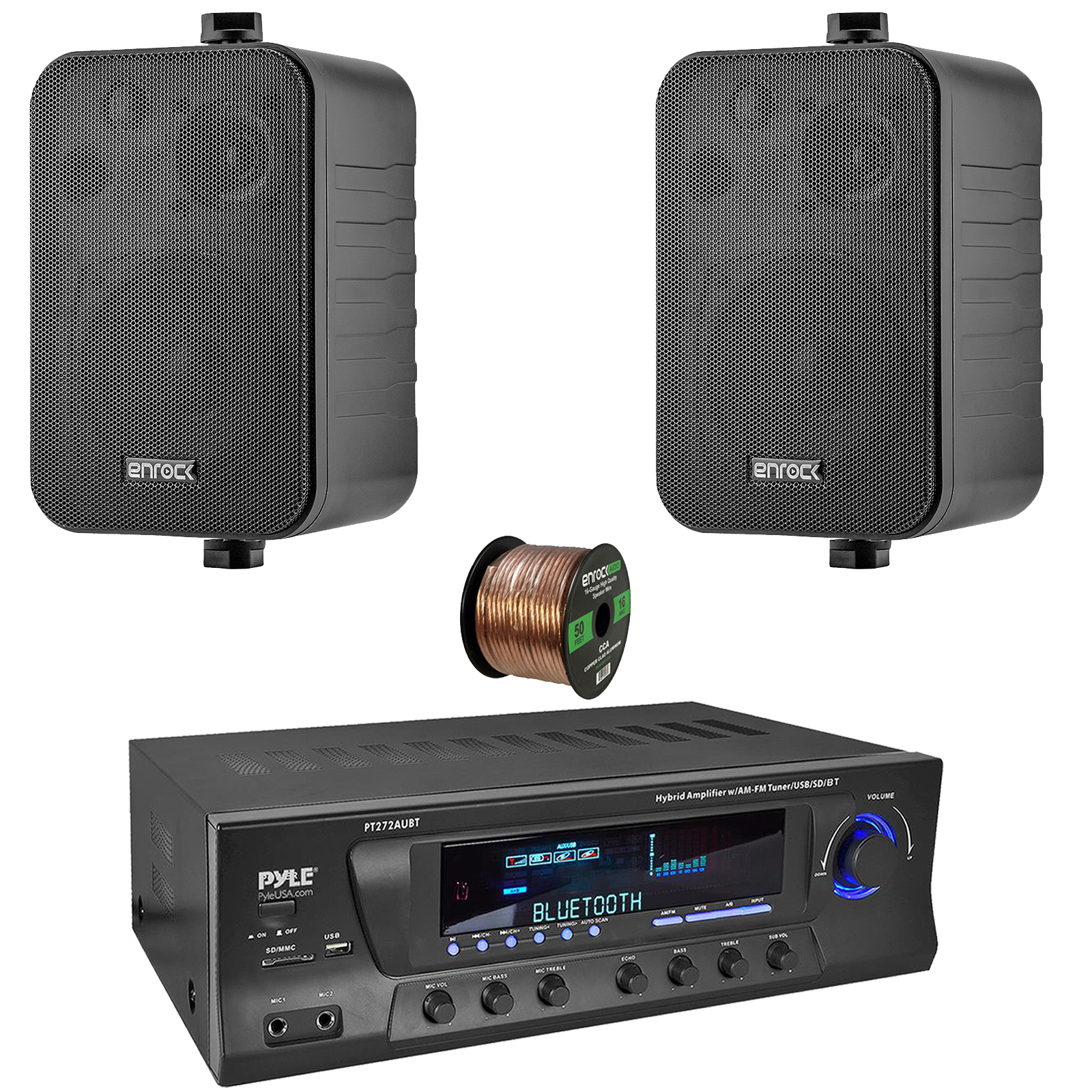 PACKAGE BUNDLE INCLUDES: Pyle PT272AUBT High-Power 300 Watt Max Power Bluetooth Home Theater Amplifier Receiver with AM/FM Radio, MP3 & USB Playback, 2x Enrock EKMR408B 4" 30 Watt Max Power 3-Way Indoor/Outdoor Black Speakers, 50 Feet 16 Gauge Speaker Wire
