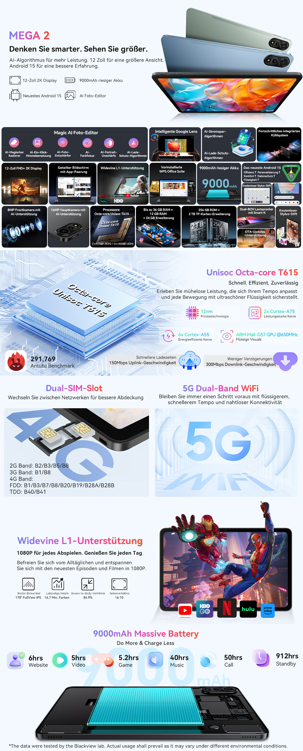 Batterie ---------- 9000mAh, bis zu 18 Stunden täglicher Nutzung
