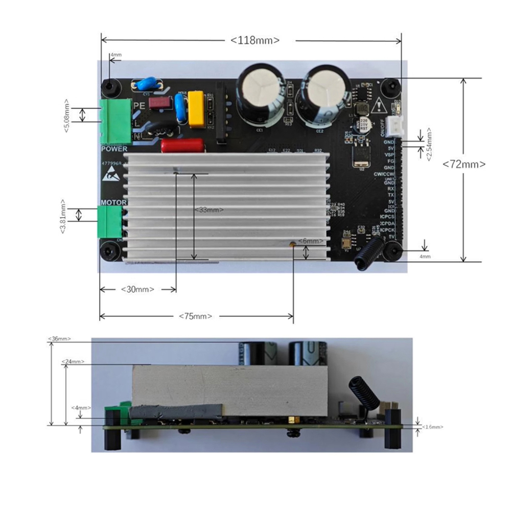 The length and width of the drive module are 118x72mm, the thickness of the plate is 1.6mm, and the working voltage is 220V.