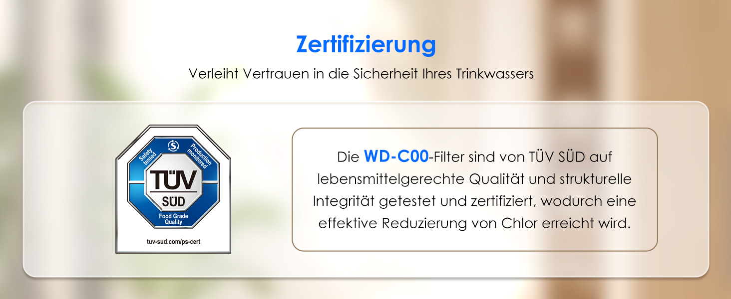 Unsere Filter sind vom TÜV SÜD auf die Reduzierung von Chlor im Wasser geprüft und zertifiziert.