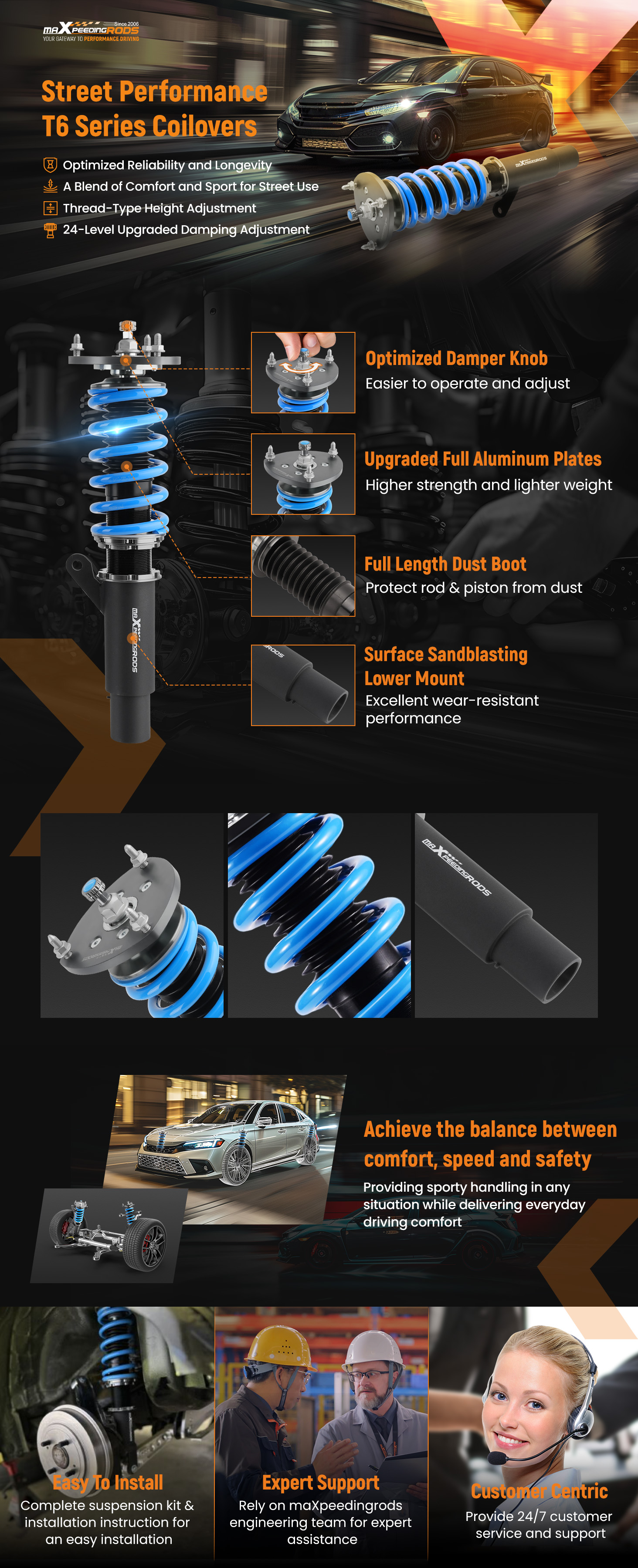 maXpeedingrods T6 lowering coil-over, standard with adjustable rebound damping, separate height adjustment without changing preload, developed damping oil and upgraded racing springs, adjustable camber plate(for some vehicles), and decent outlook, offers you more ability to tune your suspension on performance and gives your vehicle more impressive appearance. Besides, all our coil-overs are assembled in a dust-free factory, which turns out good quality and long life.