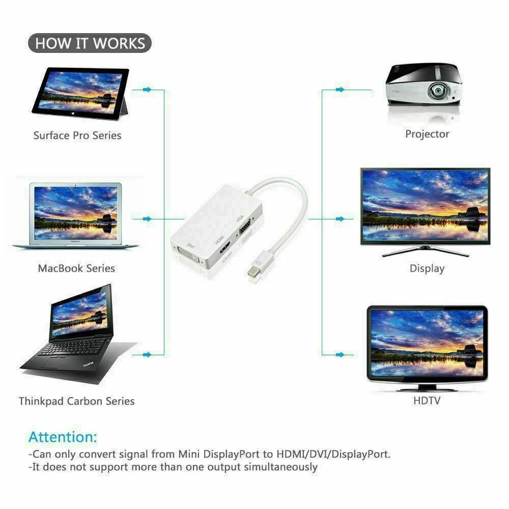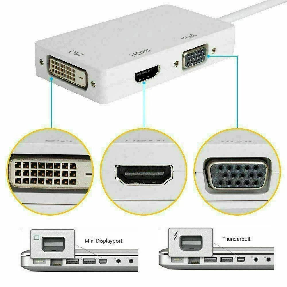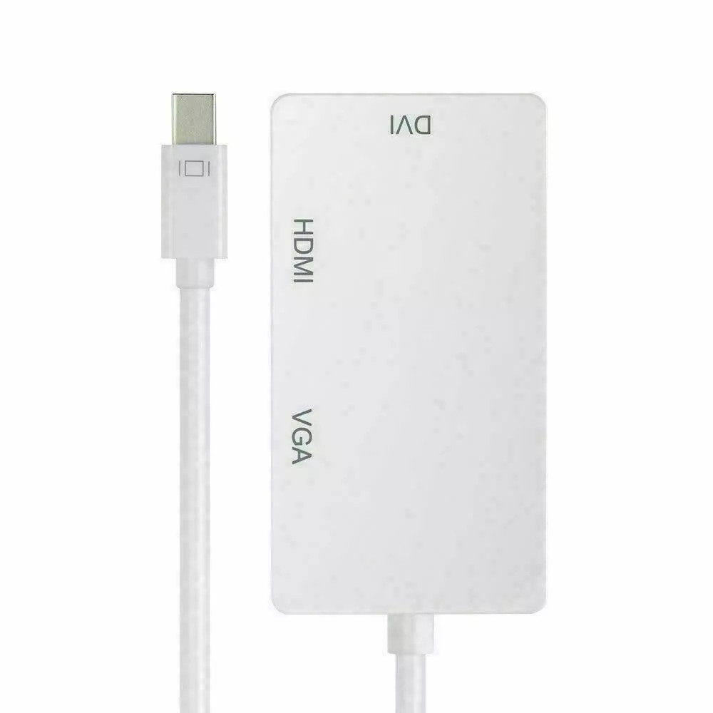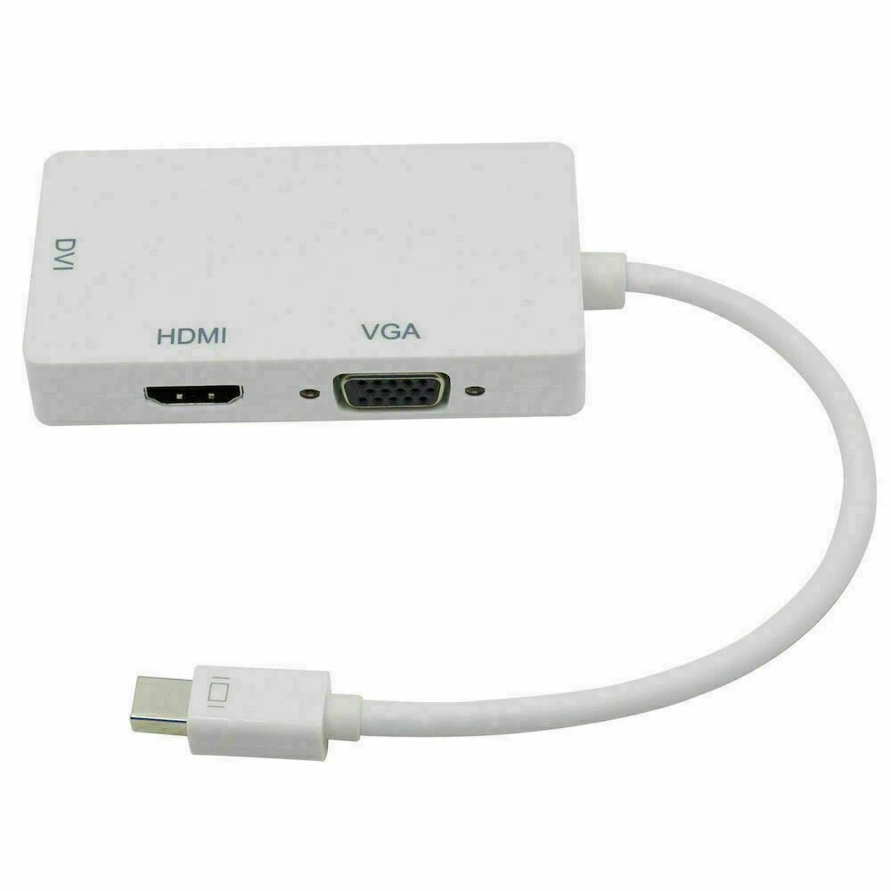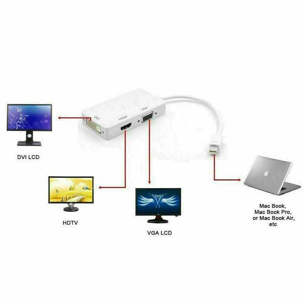 The product seamlessly connects Mac Book, Mac Book Pro, or Mac Book Air with a Mini DisplayPort to high definition displays with HDMI, DVI or VGA. It is easy and convenient to use, with three output ports: DVI VGA HDMI. And you can use one of them at a time as your demand when you want to use the DVI output, you just need to connect the DVI devices using a DVI cable. When you want to use the HDMI output, you just need to connect the HDMI devices using an HDMI cable. When you want to use the VGA output, you just need to connect the VGA devices using a VGA cable.