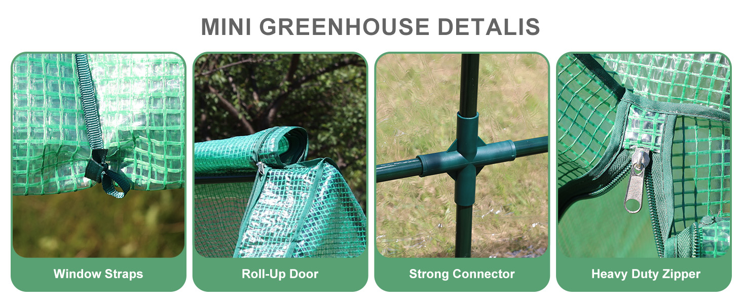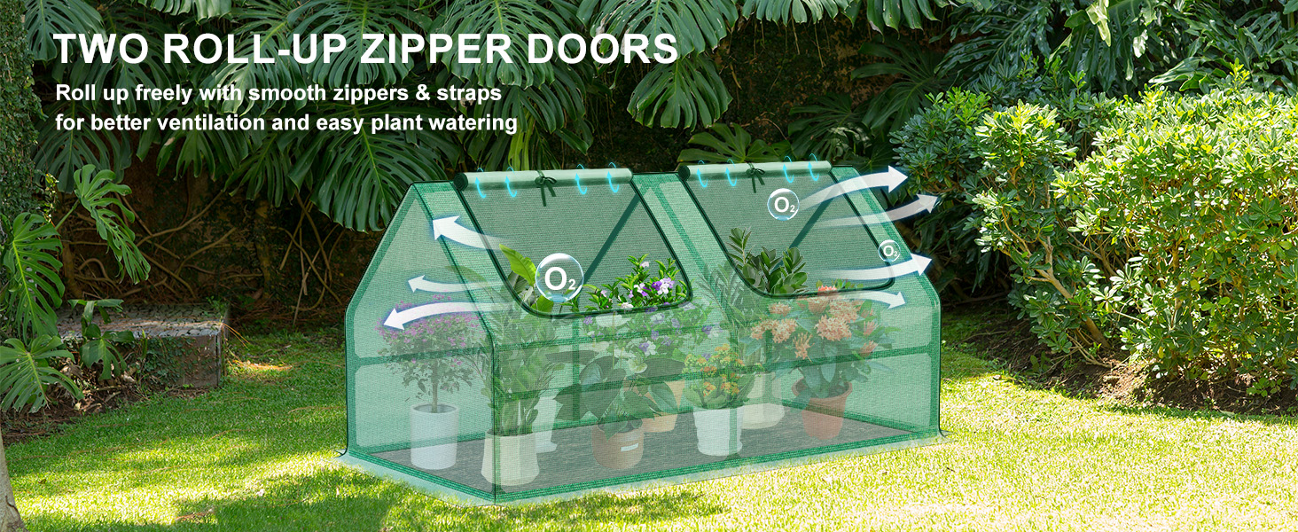 - 【ZIPPER DOOR】 - Two roll-up zipper door design allows for easy access of the greenhouse for watering plants, creating great air circulation and adjusting the temperature and humidity levels in order to achieve optimal growing environment.