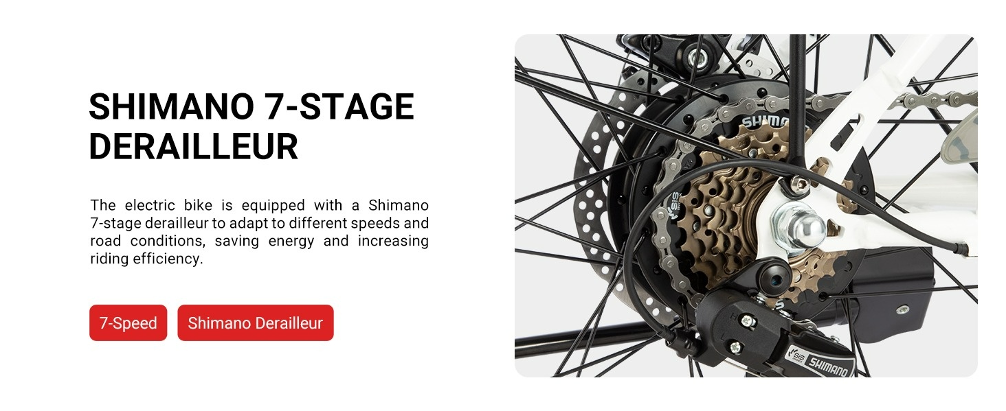 Ausgestattet mit einer Federgabel und einer Shimano 6-Gang-Schaltung bietet das C6 eine sanfte und anpassungsfähige Fahrt auf unterschiedlichem Gelände und bei unterschiedlichen Straßenbedingungen.