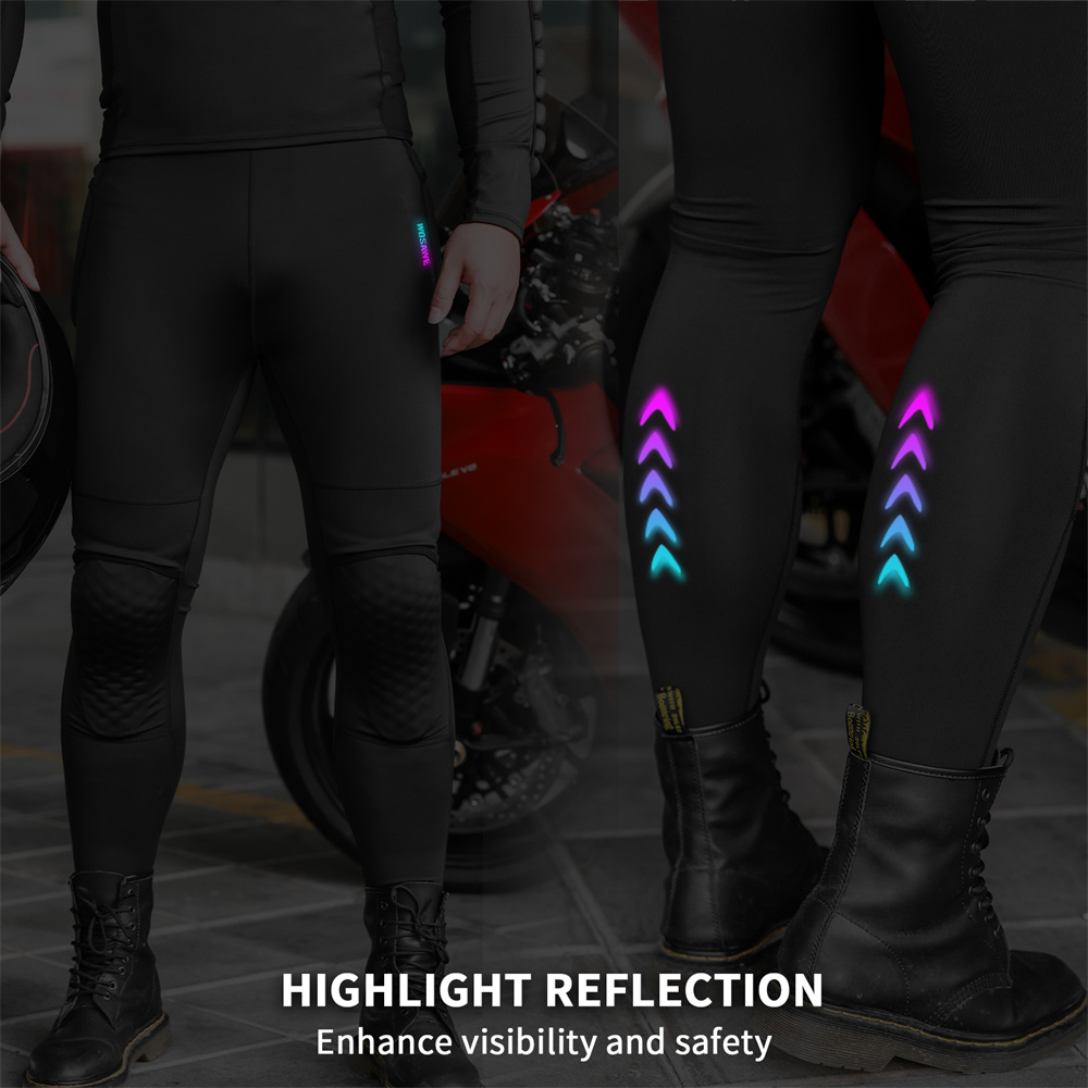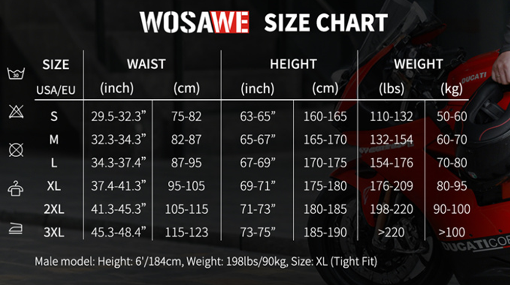 Men's Motorcycle Pants with Soft Pads Color: Black Size: S, M, L, XL, 2XL, 3XL 1. 【Second-Skin Flex】 High-stretch yoga fabric for zero-restriction fit, eliminating muscle fatigue on long rides. 2. 【WOSAWE Waistband】 Jacquard elastic waist prevents riding pressure while enabling quick on/off. 3. 【CE-Certified Armor】 Detachable knee/hip pads with honeycomb shock absorption (60J impact resistance). 4. 【Night Safety】 Reflective WOSAWE on thigh and reflective panels on rear calf. 5. 【2-in-1 Convertible】 Motorcycle with protectors, removable for fitness, wearable alone or as base layer.
