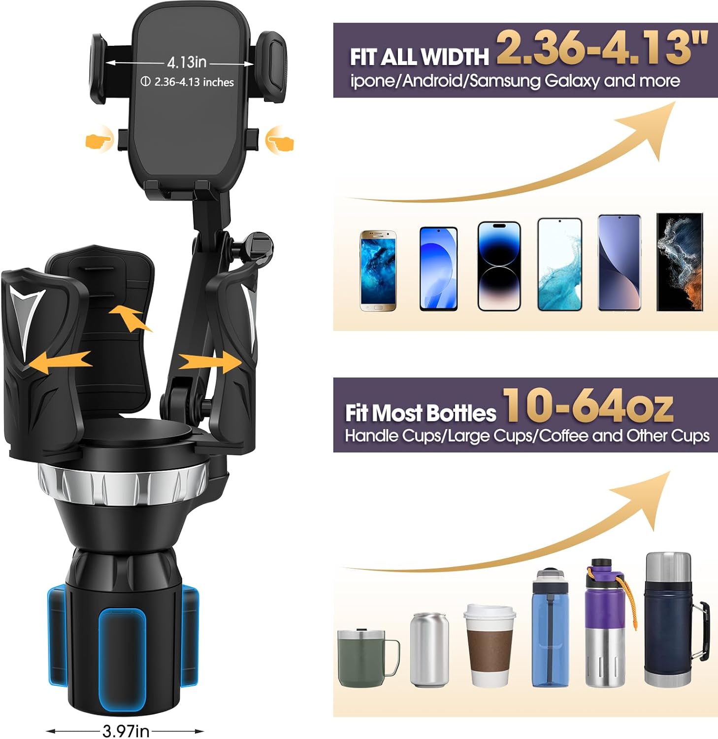 Designed to accommodate large tumblers, mugs with handles, and bottles up to 64 oz—perfect for Yeti, Hydro Flask, and more.