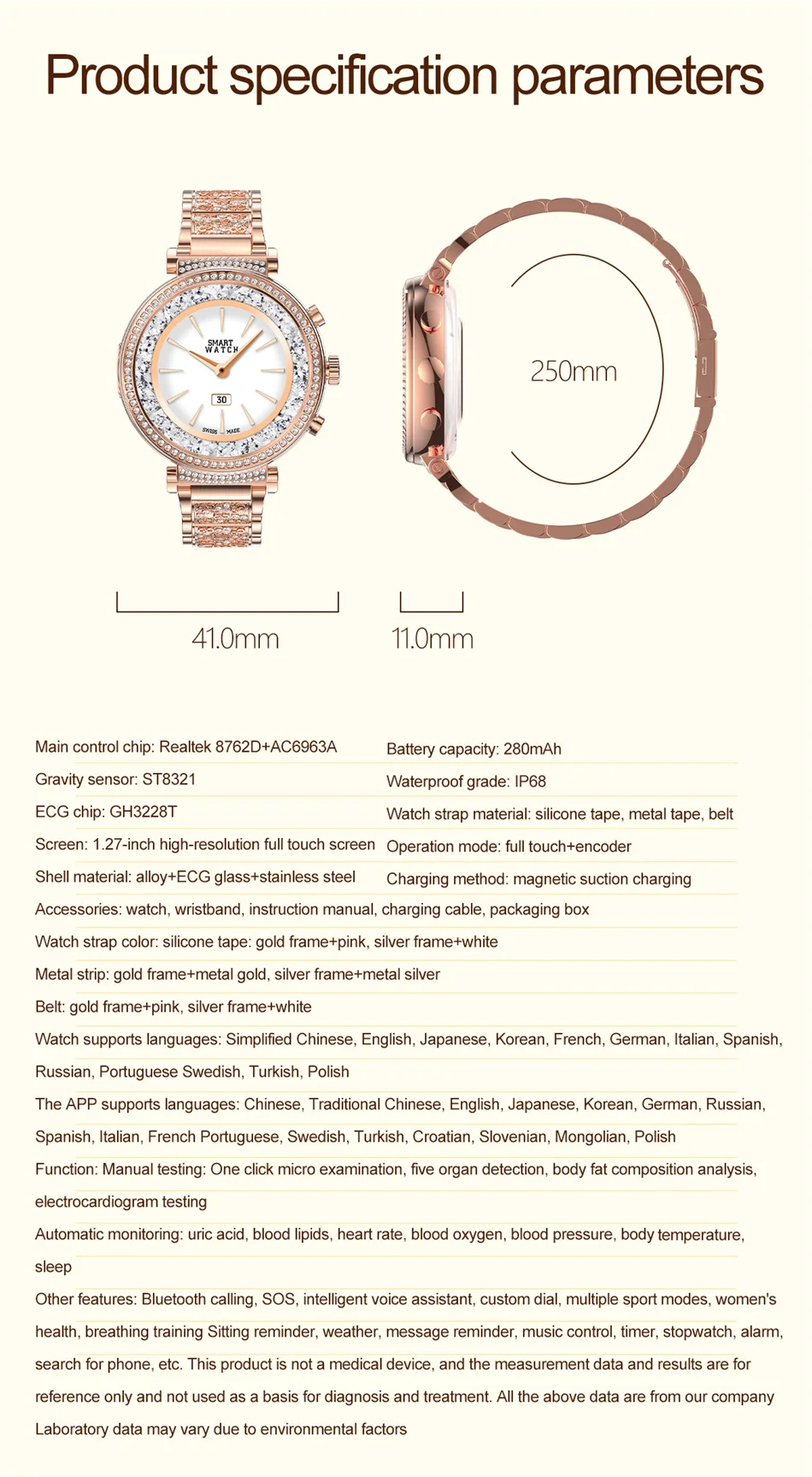 Watch languages: Simplified Chinese, English, Japanese, Korean, French, German, Italian, Spanish, Russian, Portuguese, Swedish, Turkish, Polish