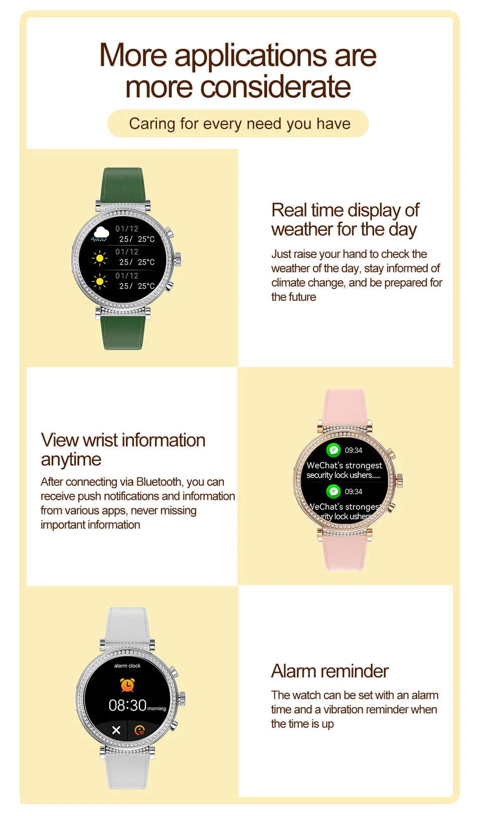 Other functions: respiratory training, high body temperature reminder, high heart rate reminder, message reminder, stopwatch, countdown, step count, calories, distance, exercise mode, incoming call reminder, alarm reminder, sedentary reminder, raised hand screen, social sharing (WeChat, QQ, Facebook, Twitter), etc., shake photo, music control, water reminder, medication reminder, access to WeChat exercise, Apple Health, etc