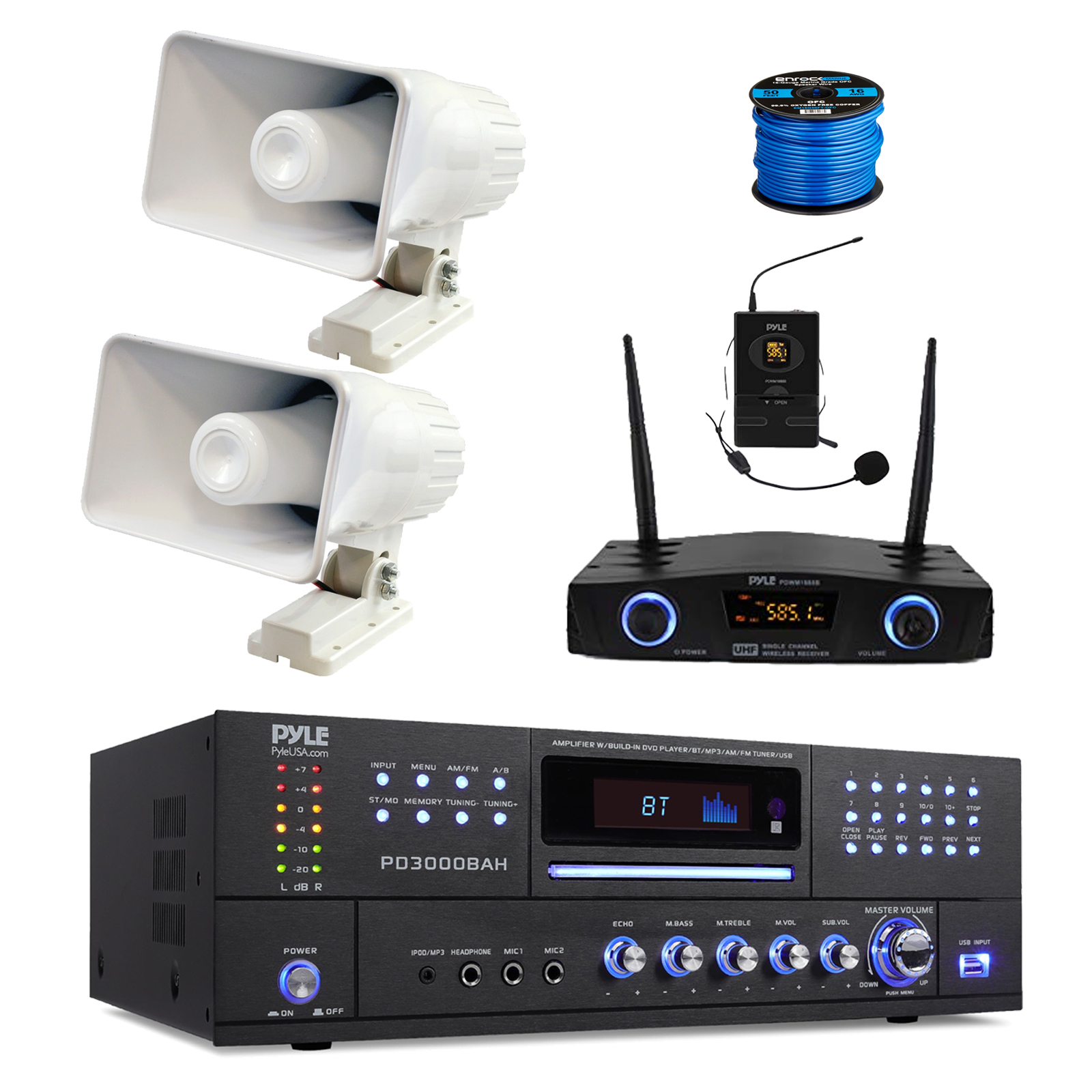 • PACKAGE BUNDLE INCLUDES: Pyle PD3000BAH Home Theater 4-Channel 4000 Watt Bluetooth HDMI Stereo CD/DVD Amplifier Receiver, Wireless UHF Microphone System, 2x 6" 50 Watt Indoor/Outdoor Portable PA Horn Speakers w/Wire