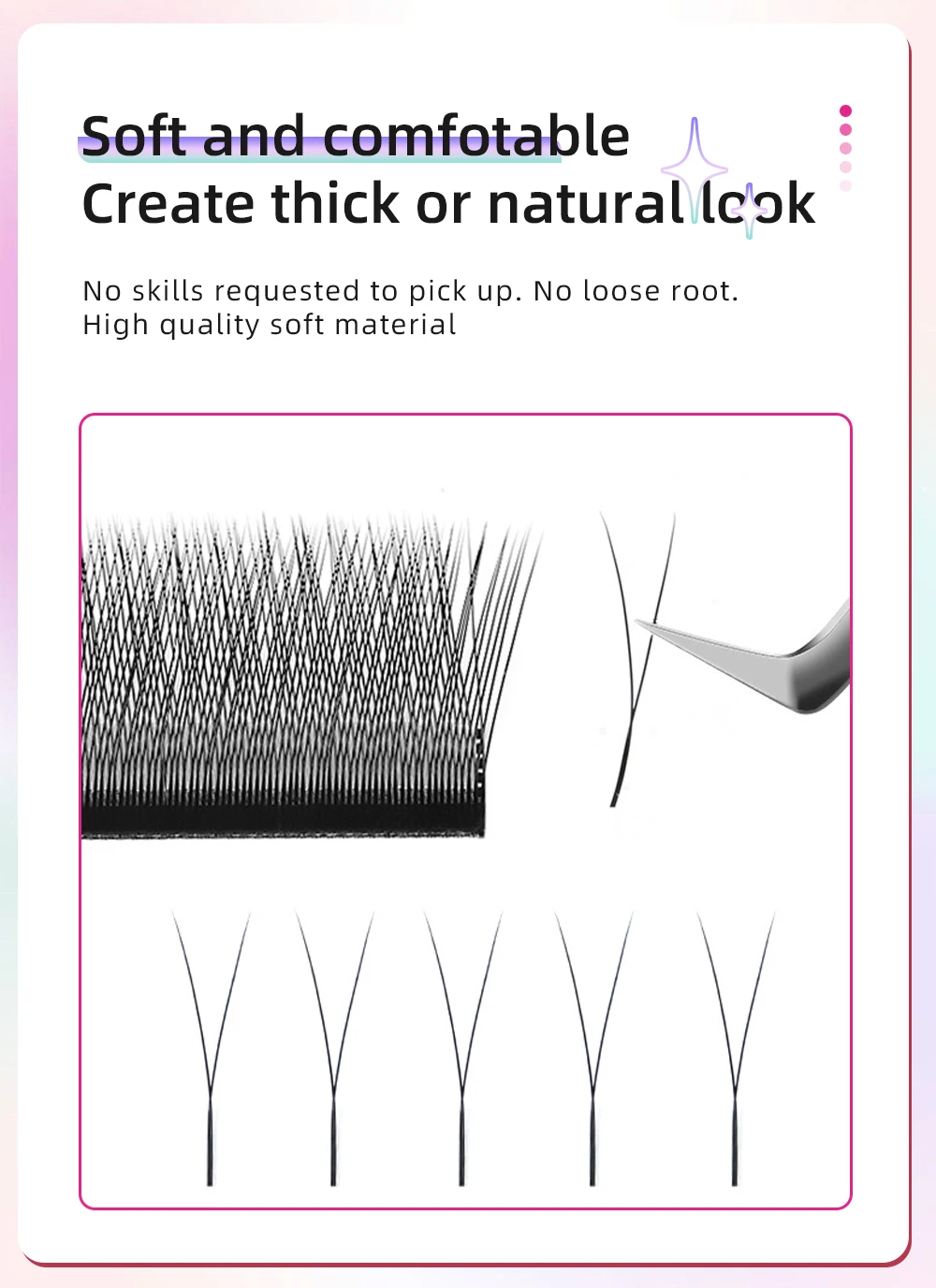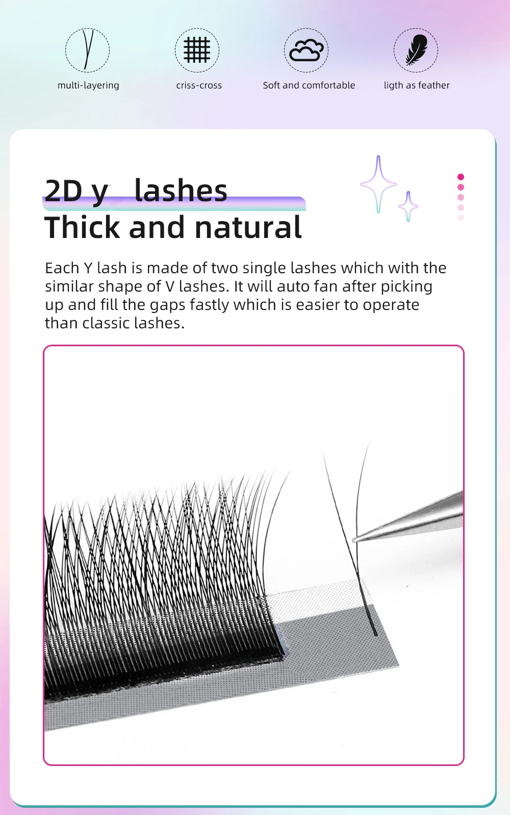 1.Professional Design and Application: This single tip 2D Y Volume Eyelash Extensions is specially designed for professional lash artists. You can easily apply them to your customers' lashes, adding an incomparable elegance and natural beauty.