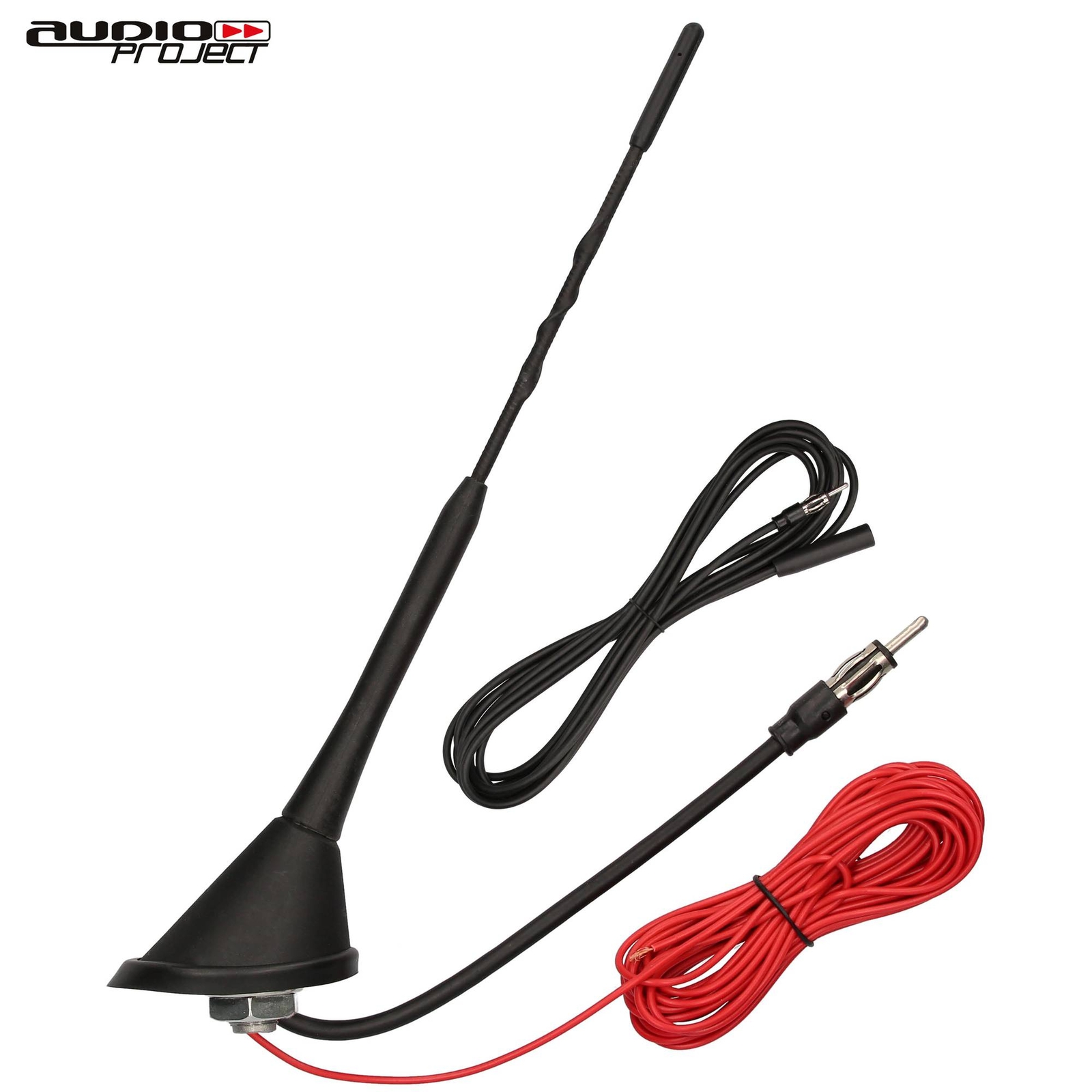 Audioproject A289 - Universal 24 / 28 cm Mini Autoradio Kurzstabantenne AM FM / UKW - DIN Stecker incl. Verstärker + 20dB ?3 + 5m Stromkabel + 5m Antennenverlängerung mit DIN Buchse + Stecker
