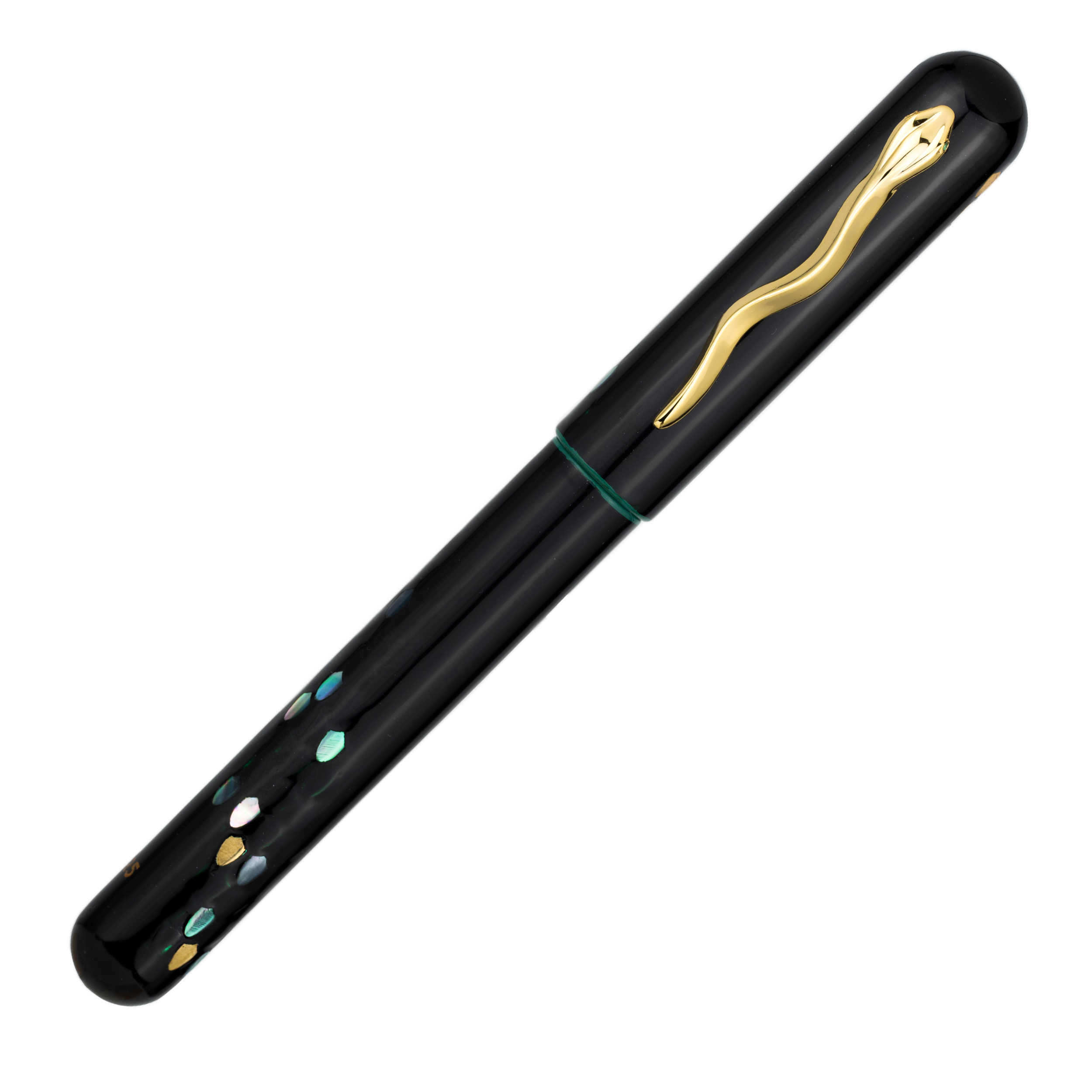 The rounded, cylindrical body profile draws inspiration from the Nahvalur Nautilus design. It is finished in deep black urushi lacquer with shimmering raden inlays that coil elegantly around the barrel, evoking the lithe movement of a serpent beneath moonlight.