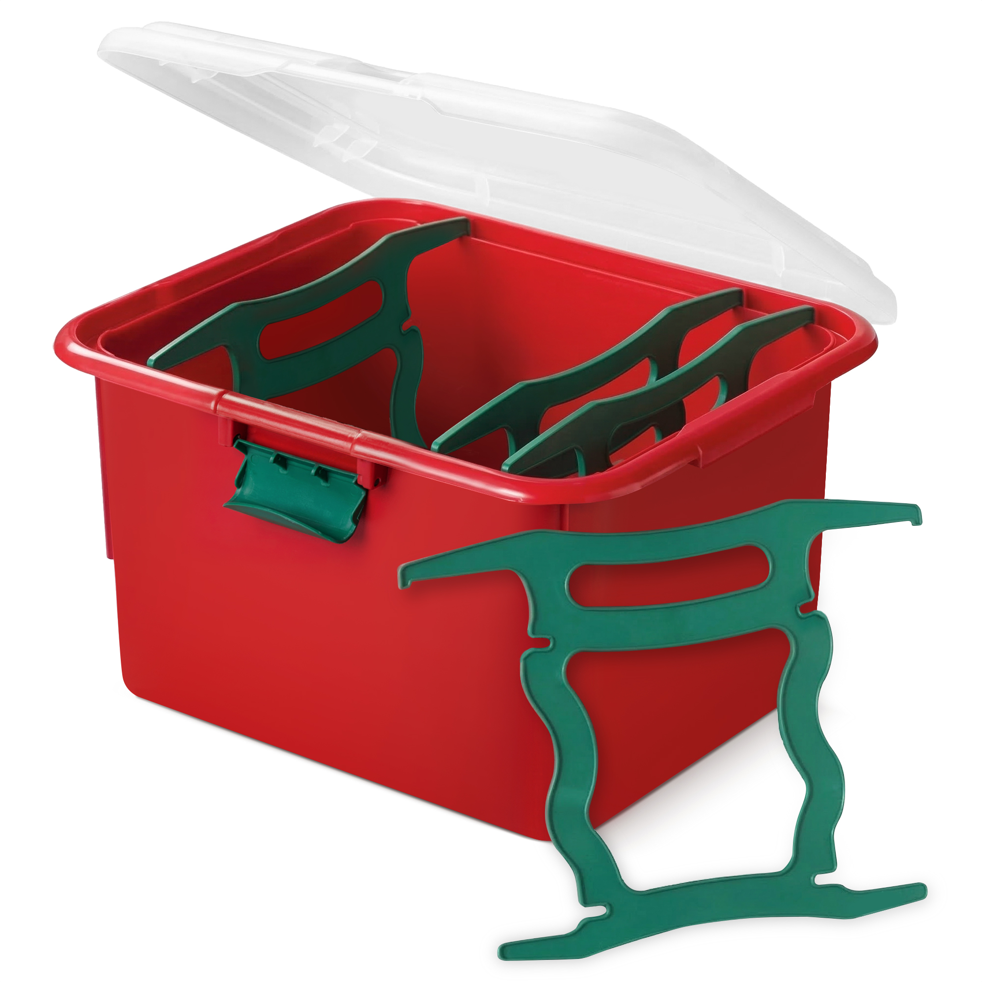 This Christmas light storage box is specifically designed for both indoor and outdoor string lights. Its wide, deep design allows you to install up to 8 cord wrap organizers, keeping the strings separate and organized from January to November. 4 cord wrap organizers are included with the holiday decoration storage container to get you started. Lightweight, rigid plastic is used to craft the box, featuring a festive red and green color scheme. The lid is hinged, letting you open it fully without having to find a place to set it aside. A snap-tight design makes sure no dust, moisture, or critters find a way to get inside while the lid's clear design lets you see inside at a glance and make sure you've got the right one.
