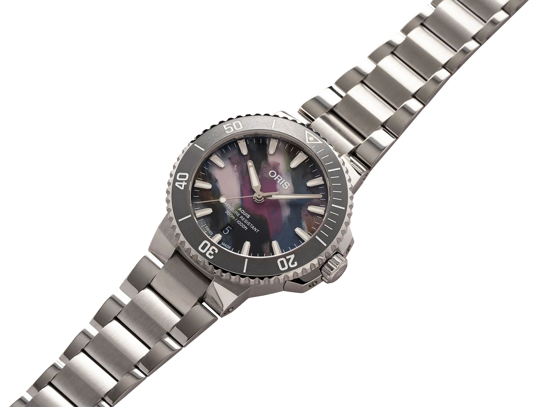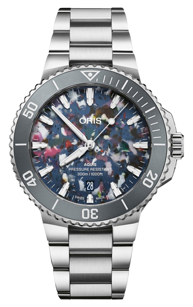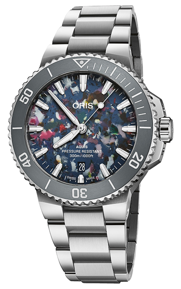 Redesigned and reengineered to even greater refinement, detailing and performance, the new Aquis collection is Oris's evergreen, everyday toolwatch that comes in a range of sizes, colors and movements. This Aquis Date Upcycle is a symbol of positive change, its recycled dial illustrating Oris's mission to bring Change for the Better and clean our oceans. It features a 41.5 mm multi-piece stainless steel case that holds a multicolored dial made out of recycled PET plastic under a double-domed sapphire crystal and is bordered by a uni-directional rotating dive bezel with a gray ceramic top ring. The unique dial has silver-tone and luminescent alpha hands with applied indices as hour markers. The protected screw down crown is situated at the 3 o'clock position while a discreet date window at the 6 o'clock position adds function and symmetry. It is fitted with a stainless steel bracelet on a security folding clasp with extension for use on a wetsuit. Showcased through the exhibition caseback is the Oris caliber 733-1, a Swiss automatic movement beating at 28,800 vibrations per hour, generating up to 41 hours of power reserve and is water-resistant up to 300 meters/1000 feet.