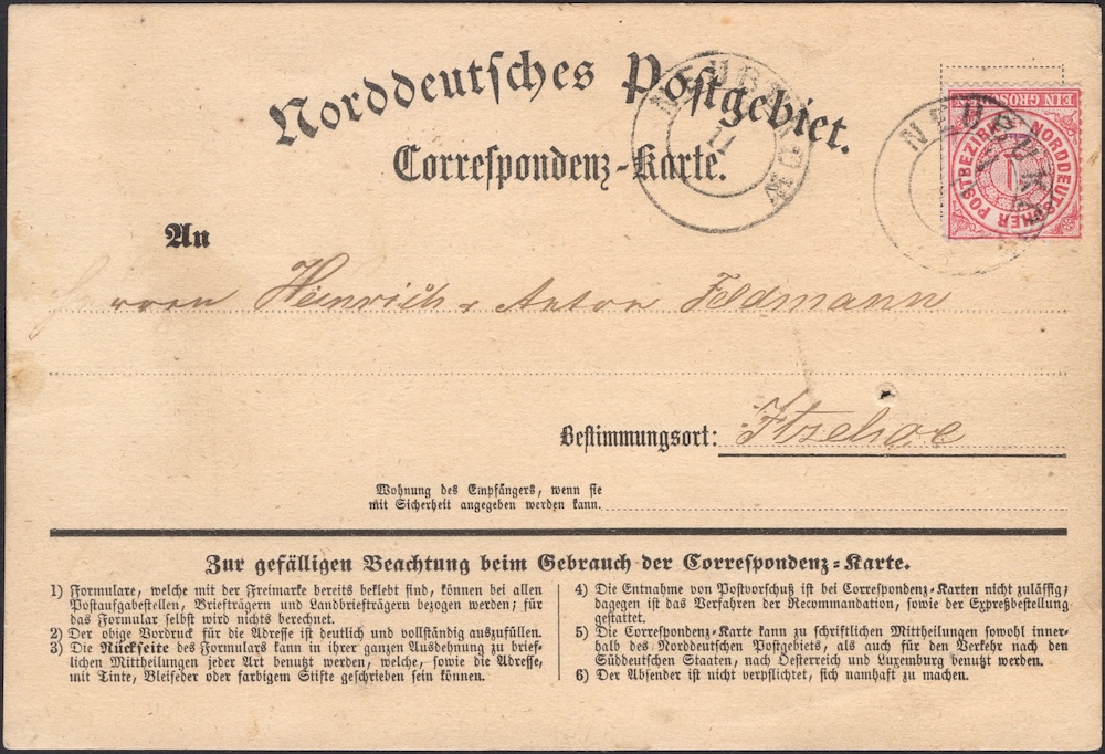 NDP Mi.-Nr. 16 auf Corrspondenz-Karte K2 Neubukow nach Itzehoe