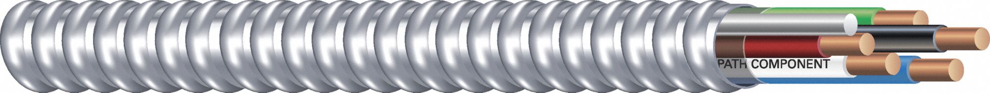 Metal Clad Armored Cable, Trade Designation MC, Wire Size 14 AWG, Number of Conductors 4 with Insulated CU Ground, Wire Color Black/Blue/Green/Red/White, Jacket Color Silver, Length 250 ft, Conductor Design Solid, Jacket Material Aluminum, Insulation Material Nylon, PVC, Nominal Outside Dia. 0.49 in, Packaging Coil, Voltage 600 V, Temp. Rating -6.8 Degrees to 194 Degrees F Dry Armored building cable is a collection of plastic-coated insulated wire bundled together and protected by a corrugated metal jacket (called a sheath or cord) that serves as a conduit and provides grounding. Also known as BX cable or metal-clad (MC) cable, armored cable prevents accidental penetration better than NM-B building cable, but it is heavier and harder to handle, rip back, and cut. It is often used in applic