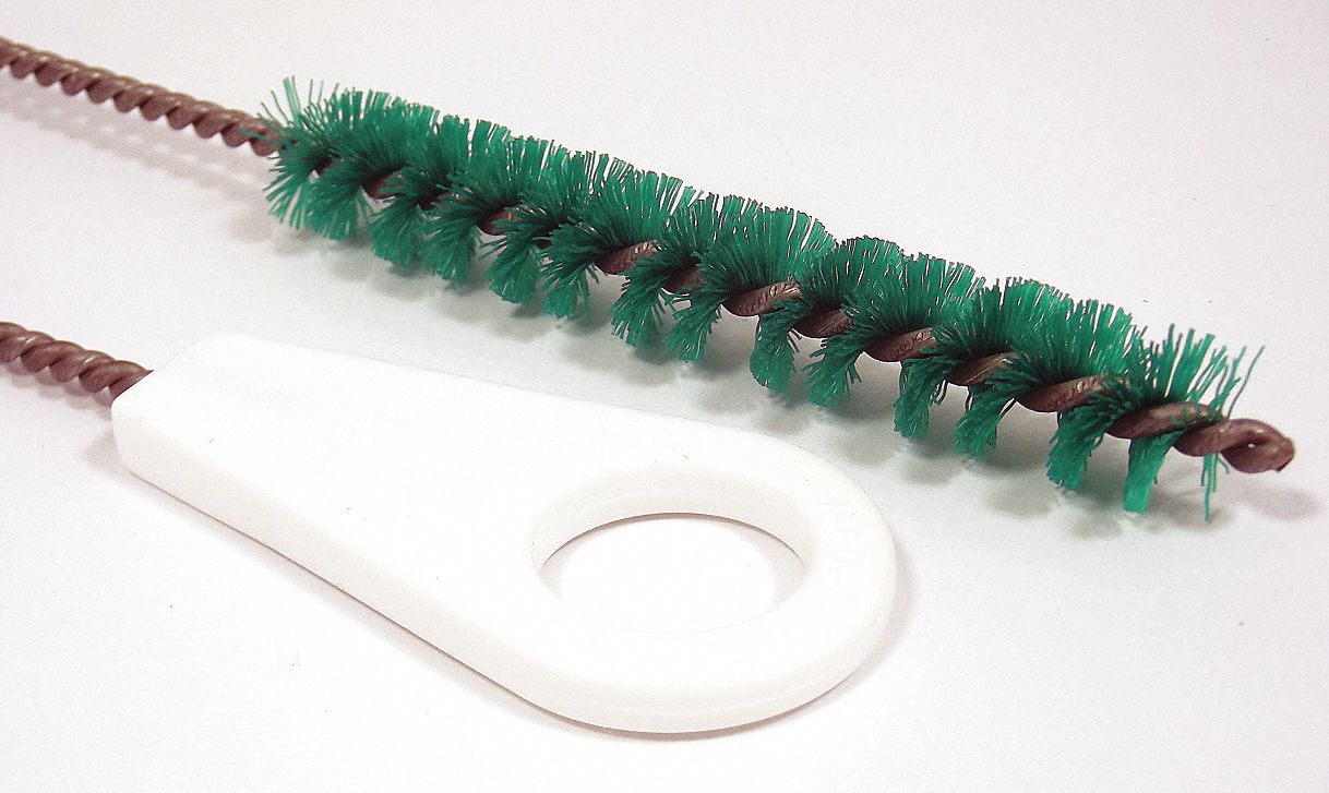 Pipe Brush, Handle Style Straight, Bristle Material Nylon, Handle Material Polypropylene, Brush Diameter 0.75 in, Brush Length 5 in, Handle Length 31 in, Bristle Color Green, Application Food Industry, Color Coding System Yes, FDA Compliant Yes, Features Single Spiral, Single Stem, Overall Length 36 in