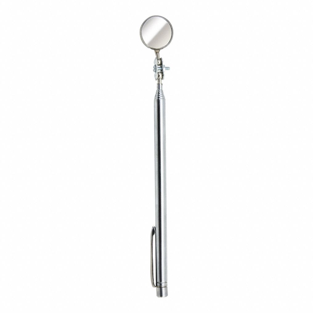 Inspection Mirror, Base Type Magnetic, Compressed Length 7 1/4 in, Extended Length - Maximum 27 1/4 in, Handle Material Brass, Handle Style Straight, Included Wheels Wheels Not Included, Magnification Not Applicable, Mirror Adjustment - Maximum 360 Degrees , Mirror Diameter 7/8 in, Mirror Length Not Applicable, Mirror Width Not Applicable, Mirror Material Glass, Mirror Shape Round, Mirror Surface Shape Flat, Shaft Type Telescoping, Use Location Indoor, Outdoor, Features Stationary Head Magnet