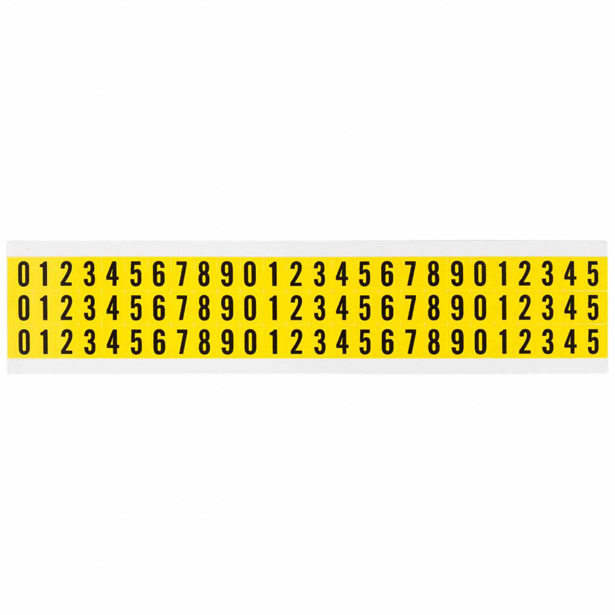 Number Label, Adhesive Type Removeable and Repositionable Adhesive, Application General Identification, Wire and Cable Labeling, APWA Compliant Color No, Background Color Yellow, Character Color Black, Character Color Gradient Solid Color, Character Height 3/8 in, Character Outline Color Not Applicable, Character Type Numbers, Characters Included 0 to 9, Die Cut Yes, Embossed No, Font Gothic, Includes (10) Labels, Indoor/Outdoor Usage Indoor Only, Letter Casing Uppercase, Material Vinyl