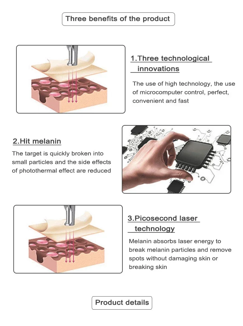Decompone la melanina: la penna a picosecondi può deformare la melanina in particelle fini, aumentando così i cambiamenti della pelle, riducendo la deposizione di melanina, riducendo le lentiggini e le macchie scure e raffinare la pelle dall'interno per un bagliore sano