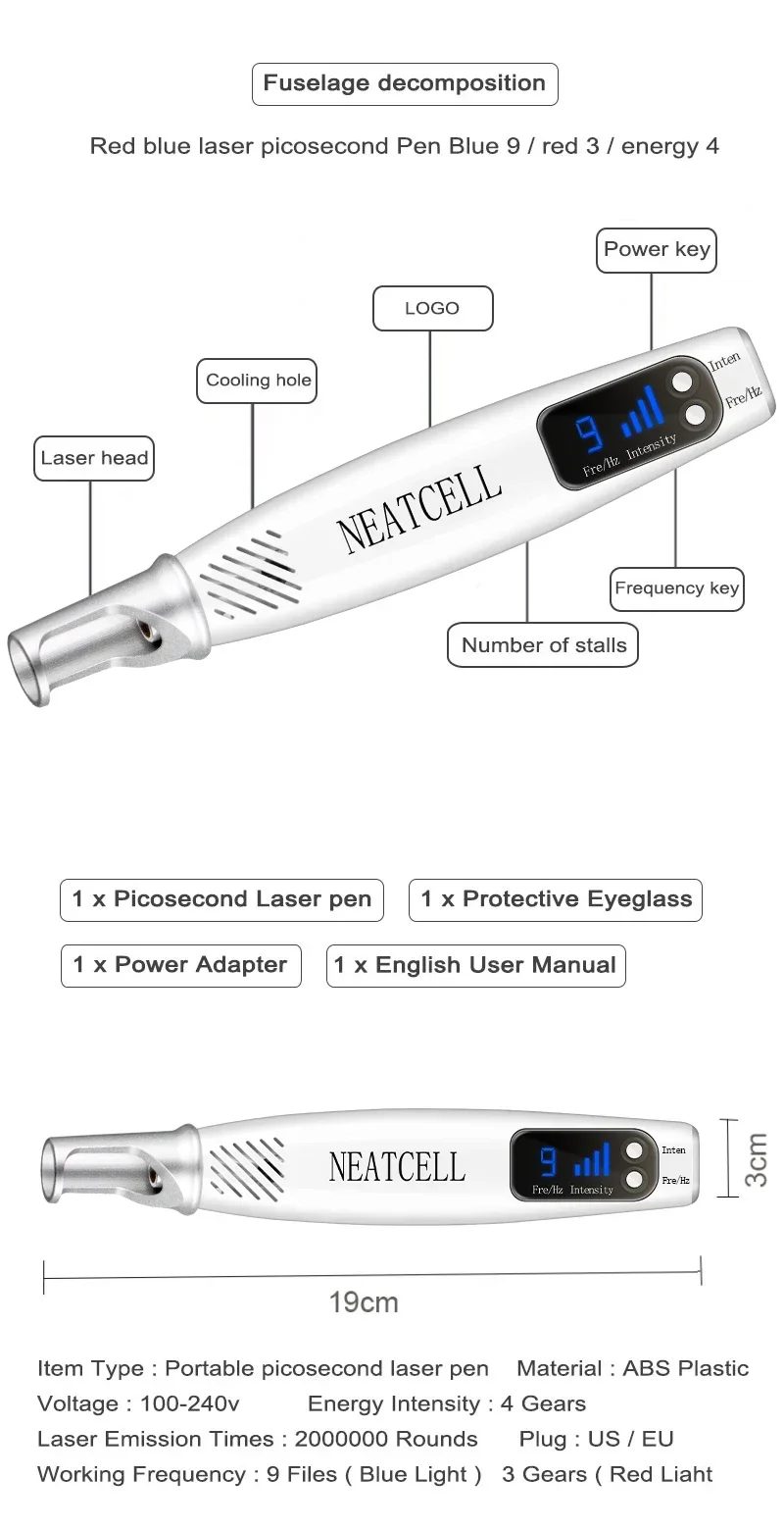 -Penna a picosecondi a luce rossa per uso domestico personale, che può essere azionata da te. La potenza e l'effetto sono più piccoli della penna a picosecondi a luce blu