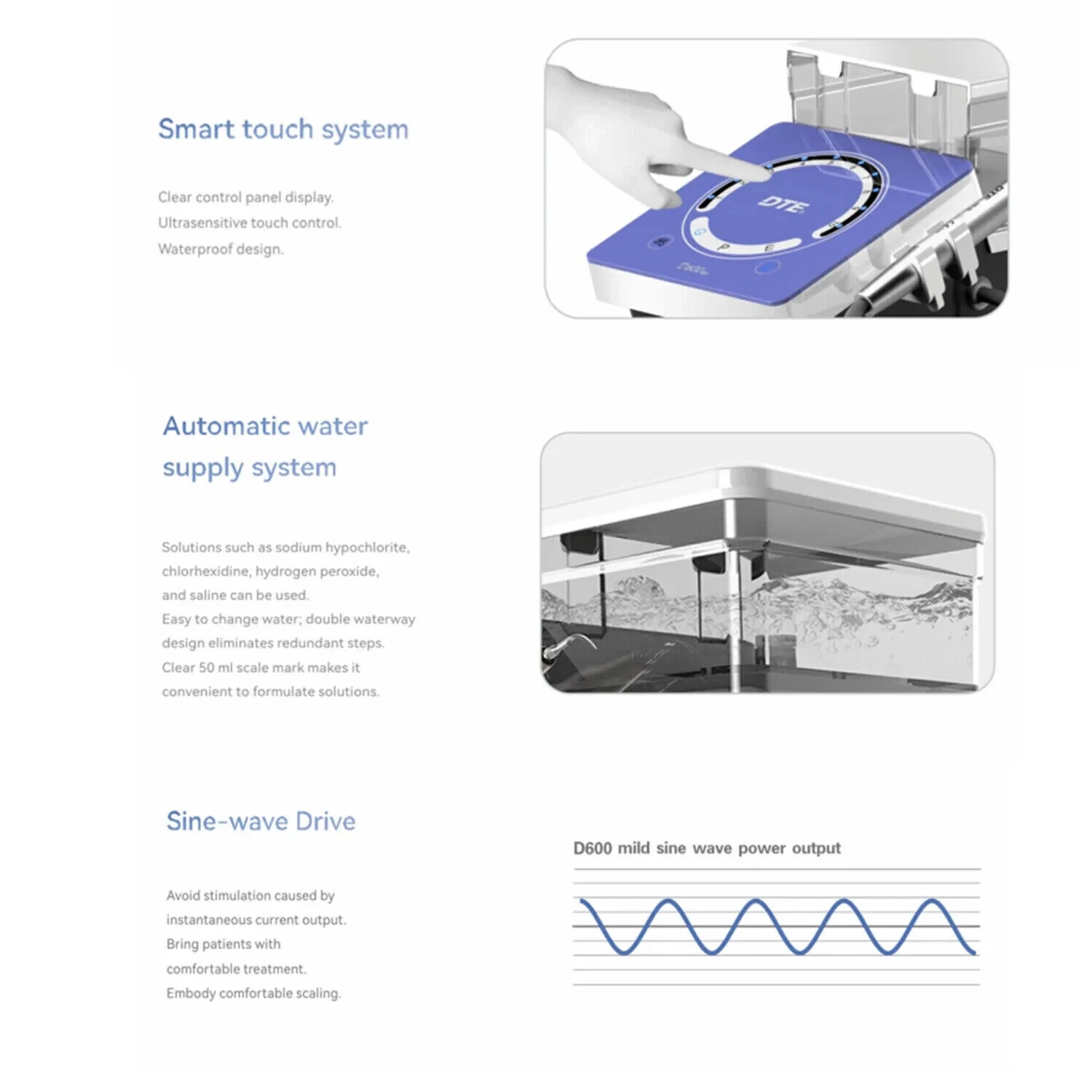 Rapid preparation, root canal orifice locating, removal of foreign body in root canal, endodontic irrigation, root canal retreatment, supragingival scaling and periodontal treatment. Compatible with more than 70 DTE tips. Metal handpiece with LED can be autoclaved.
