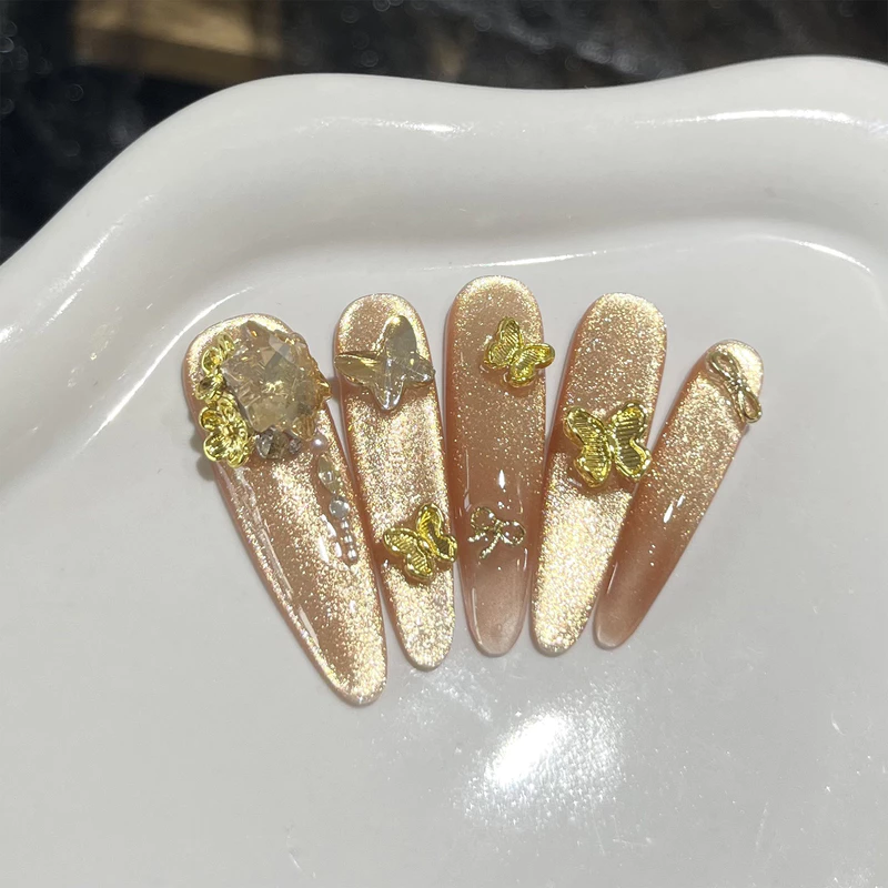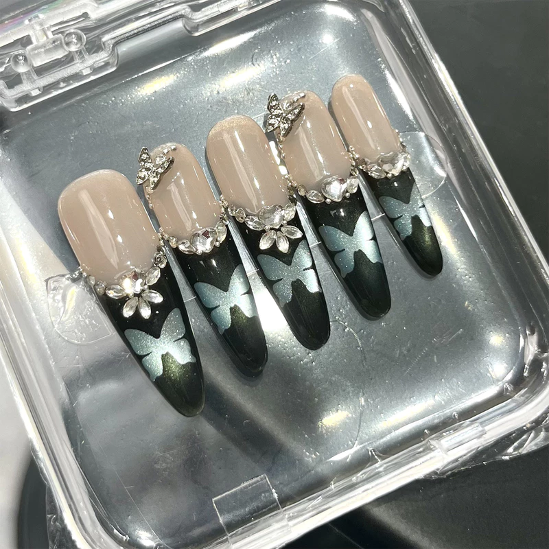 Handmade French Cat Eye 3D Diamond False Nail Long Stiletto Press On Nail