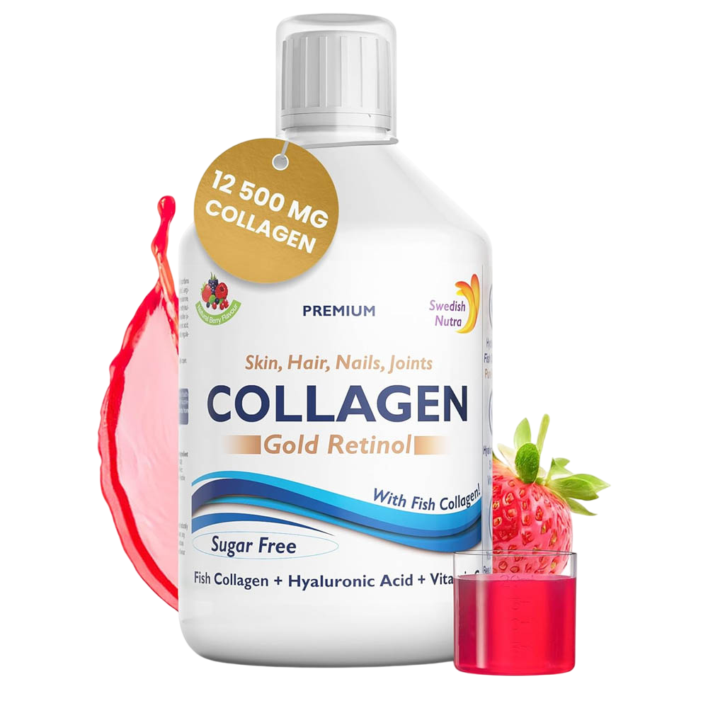 Revitalize your beauty from within with Swedish Nutraβs high-dose Liquid Marine Collagen supplement, specially designed to support glowing skin, strong hair, and healthy nails. Each 25 ml daily dose delivers a potent 12,500 mg of hydrolyzed marine collagen (type I & III), combined with a powerful blend of Retinol, Hyaluronic Acid, Biotin, and Vitamin C for enhanced results.