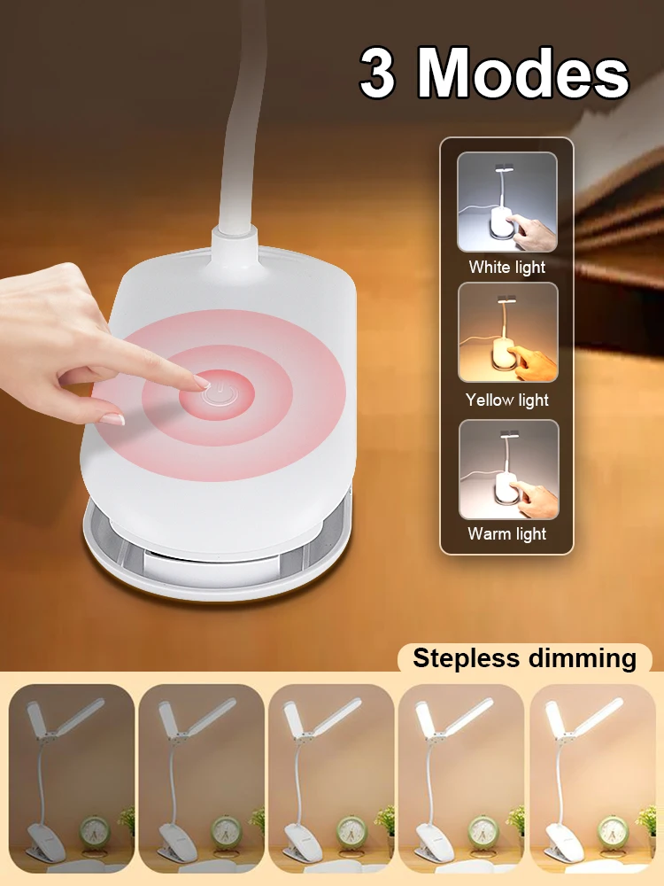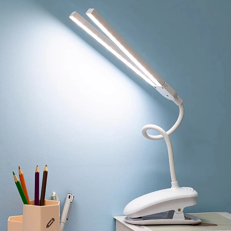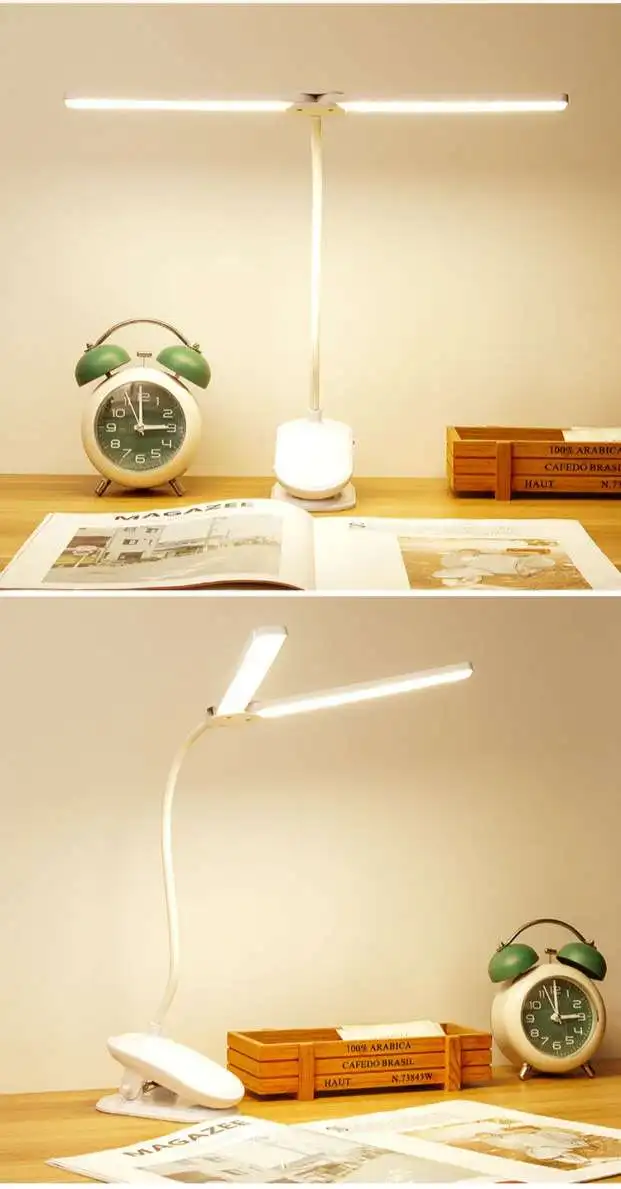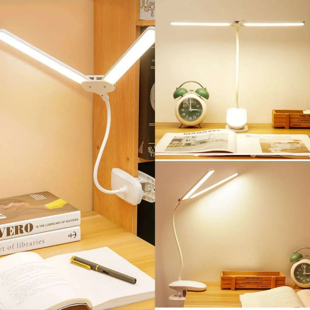 LED Table Lamp with Clip USB Chargeable Dimmable Desk Lamp 3 Colors Foldable Eye Protection 2 Heads Desktop Reading Night Lights