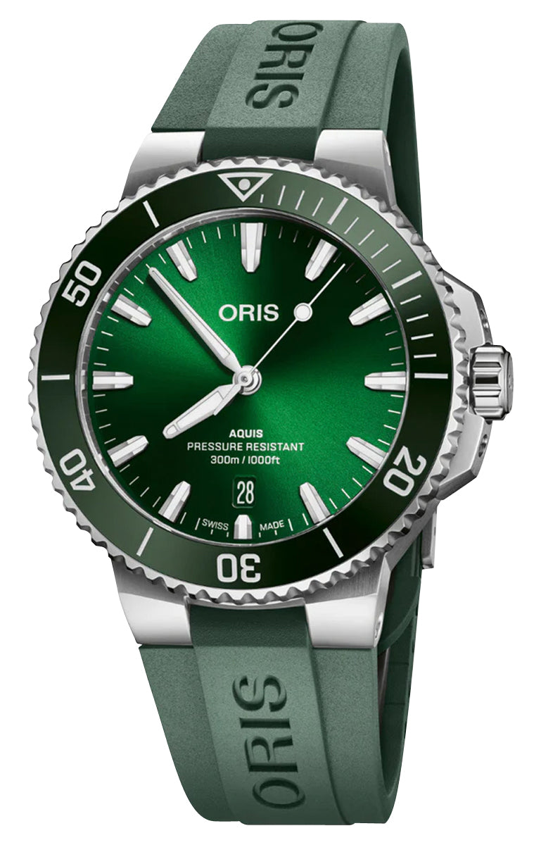 Redesigned and reengineered to even greater refinement, detailing and performance, the new Aquis collection is Oris's evergreen, everyday toolwatch that comes in a range of sizes, colors and movements. This Aquis Date features a 41.5 mm multi-piece stainless steel case that holds a sunray green dial under a double-domed sapphire crystal and is bordered by a uni-directional rotating dive bezel with a luminous bezel marker on a matching green ceramic top ring. The dial has silver-tone and luminescent alpha hands with applied indices as hour markers. The protected screw down crown is situated at the 3 o'clock position while a discreet date window at the 6 o'clock position adds function and symmetry. It is fitted with a green rubber strap on a security folding clasp with extension for use on a wetsuit. Showcased through the exhibition caseback is the Oris caliber 733-1, a Swiss automatic movement beating at 28,800 vibrations per hour, generating up to 41 hours of power reserve and is water-resistant up to 300 meters/1000 feet.