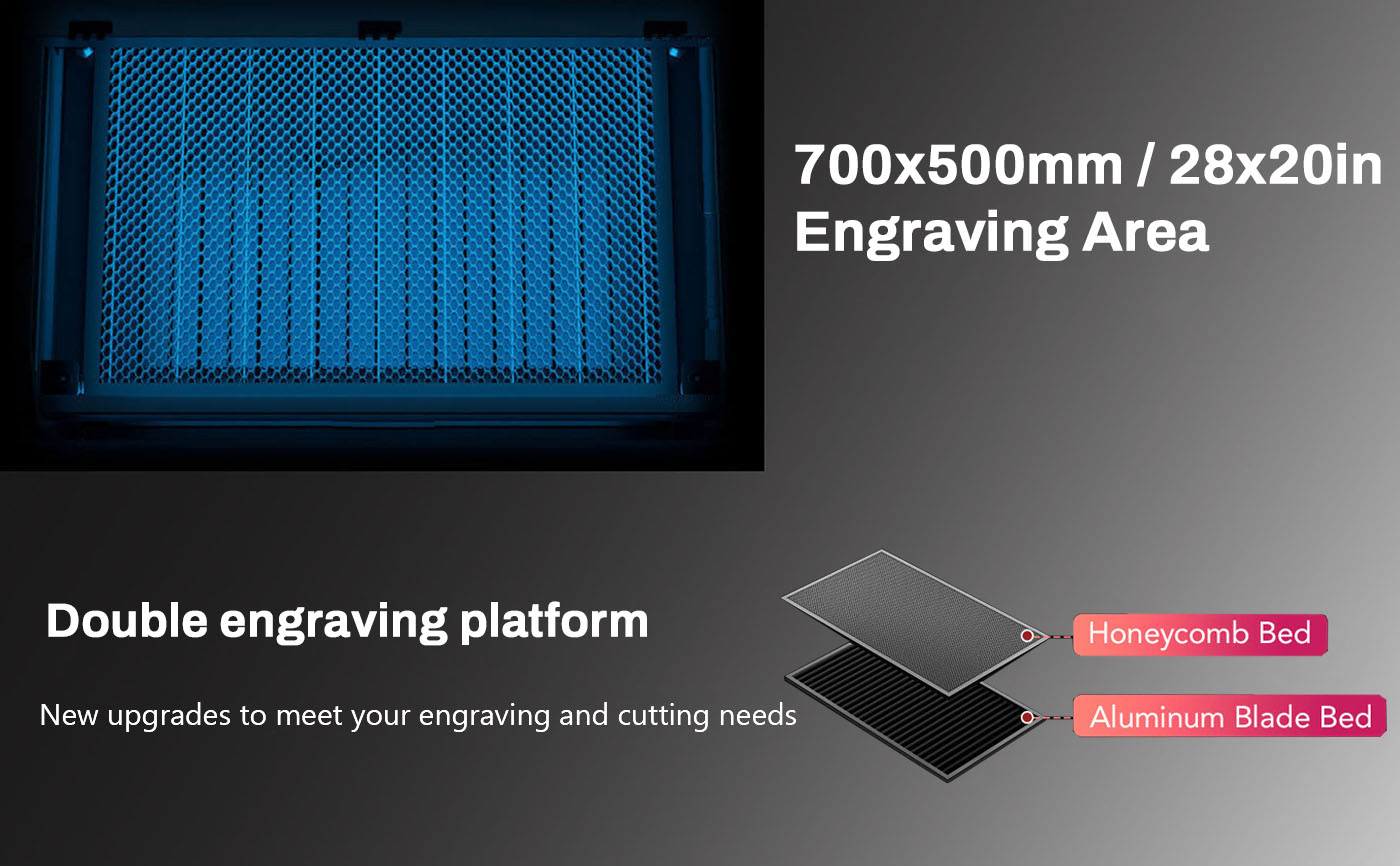 ♡ The 28″ × 20″ (700×500 mm) workbed gives you plenty of space to work on wood, rubber, plastic, paper, fabric, leather, ceramics, tile, fiberglass, marble, stone, and more—even before you open the integrated pass-through doors that permit you to work on even larger pieces!