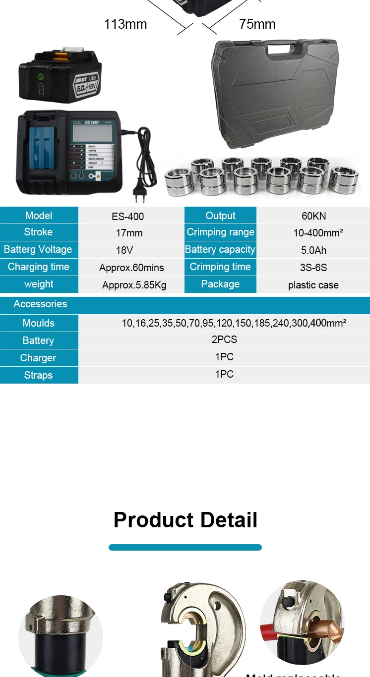 2.The tool boasts a wide crimping capacity of 400mm², covering a broad range of applications to meet diverse industry needs. Its interchangeable dies allow for efficient and versatile crimping, making it suitable for various cable types and sizes.