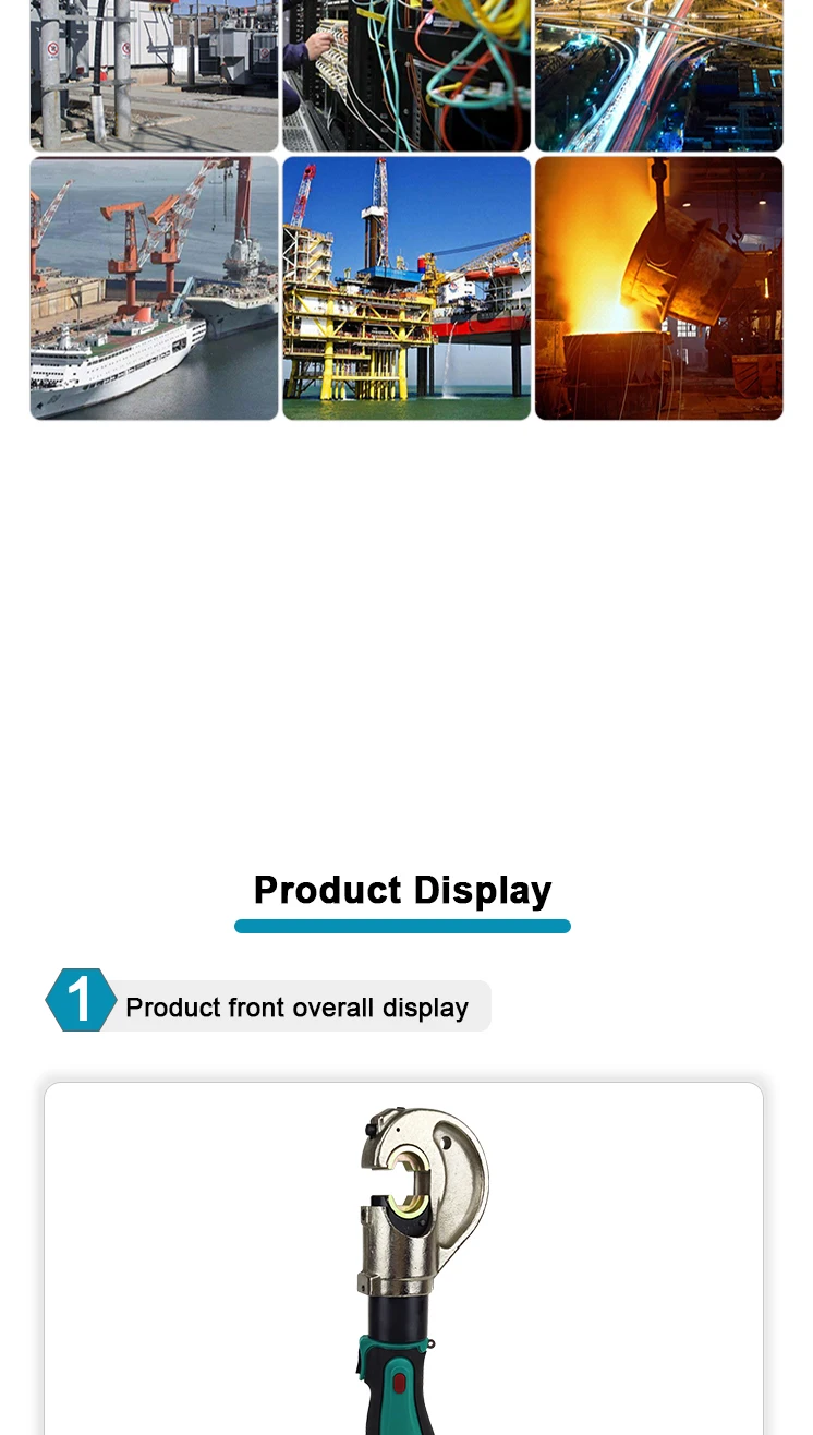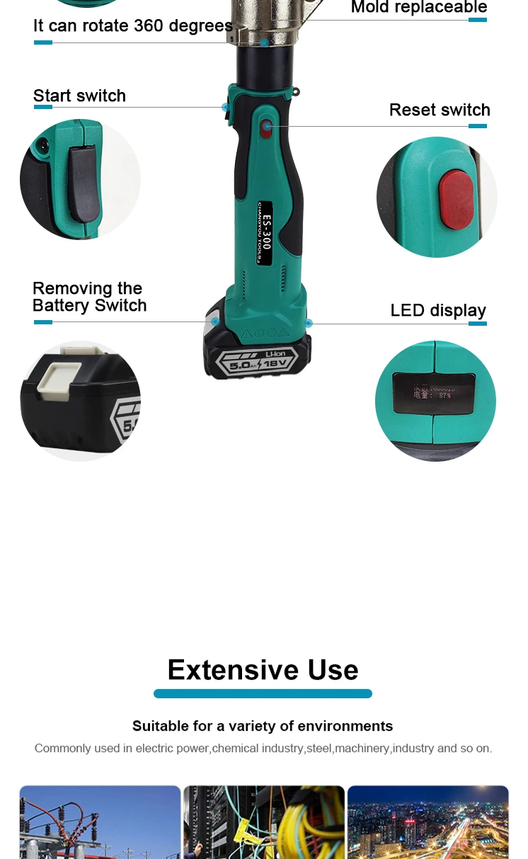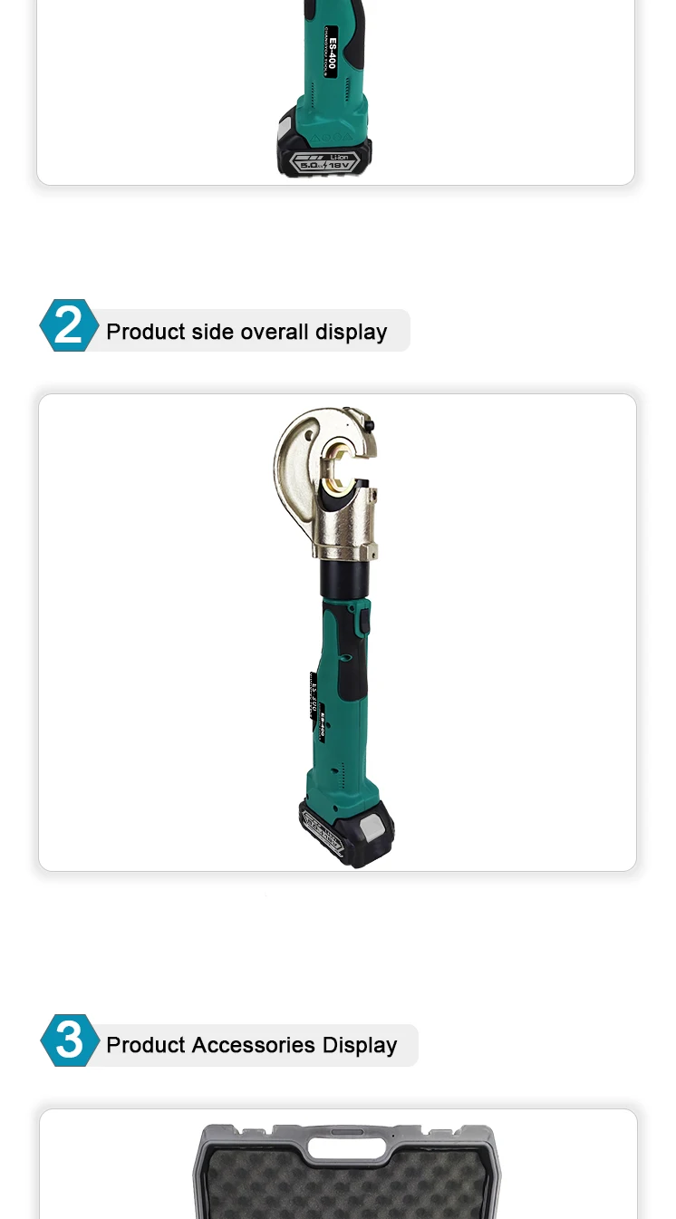 1.The ES-400 12T 400mm2 Electric Battery Powered Cable Hydraulic Crimping Tool is an advanced, eco-friendly solution for wire and cable crimping tasks. Its compact design and lightweight construction ensure comfortable use and easy portability, even for extended periods.