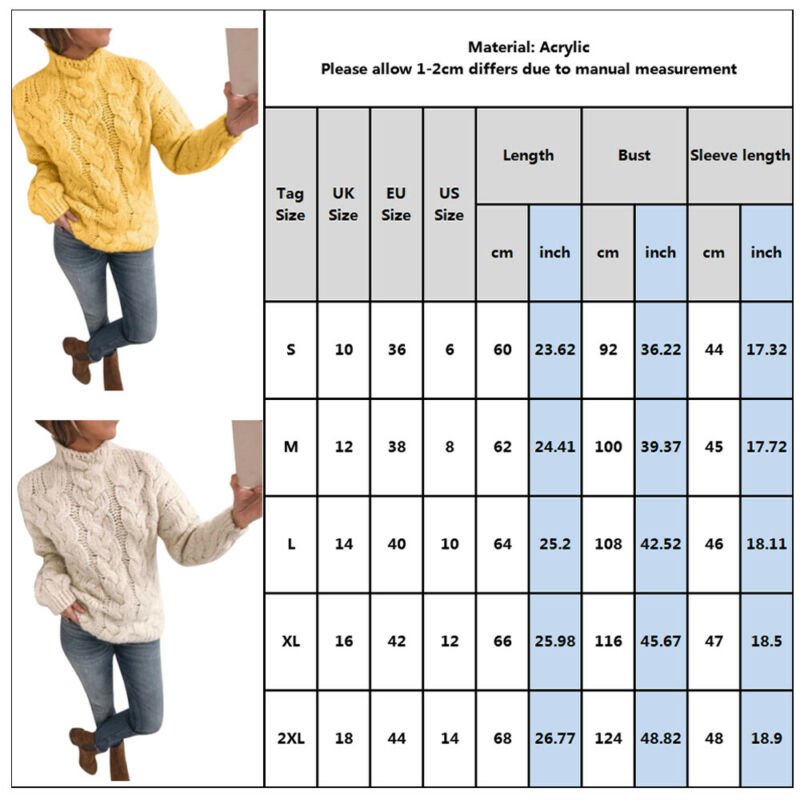 Product Features: Main Material: Acrylic Popular element: Cable sweater Occasion: Daily Style: Casual Detailing:Ribbed Cuffs Length: Regular Neckline:Stand collar Sleeve Length: Full Pattern:Solid Color Season: Spring and Autumn Size : S、M、L、XL、2XL Garment Care: Hand Wash, Machine Washable Care Instructions: Wash before wear Cold gentle machine wash Do not bleach Drip dry Package Content: 1 x Sweater About This Item(We aim to show you accurate product information) 1.Please see the size reference to find the correct size. 2.There may be slightly color difference cause of light shooting. 3.Please allow 1-3cm difference due to manual measurement(note 1cm=0.39inch) Thanks for your understanding. .jpg)