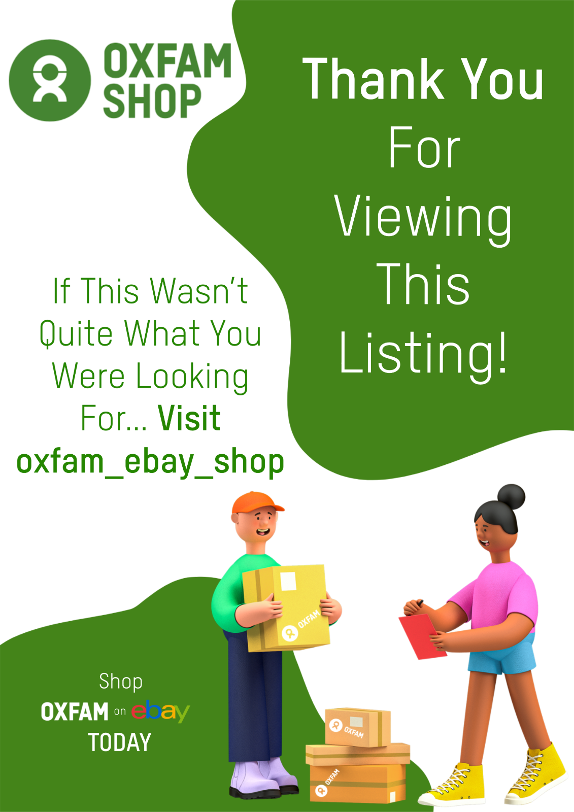 The Oxfam eBay customer service team operate from 9am-4pm Monday-Friday and we will endeavor to respond to your query within 48 hours between these operating times.
