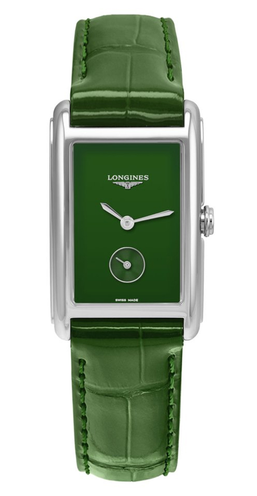 The epitome of timeless elegance and sophistication, Longines' DolceVita collection seamlessly blends classic design with contemporary flair. Characterized by its rectangular case and harmonious proportions, this series of watches were inspired by a 1920's model and are a powerful expression of the elegance and Italian sweet life, this DolceVita Monochrome features a 23.3 mm X 37 mm (including the lugs) rectangular stainless steel case that holds a lacquered and polished green dial (Spring Green) under a scratch-resistant sapphire crystal. The minimalist and elongated dial's lack of hour markers or date window gives emphasis to the silver-tone winged emblem, sword hands, and subseconds register. For time adjustment, the signed crown sits at the 3 o'clock position. It is fitted with a dial-matching green leather strap and secured by a stainless steel signed buckle. This watch has a solid caseback engraved with Longines' old winged hourglass logo with the Ernest Francillon & Compagnie signature (EFCo). Encased within is the caliber L176, a reliable Swiss quartz movement that is powered by a Renata 379 battery and is water-resistant up to 30 meters/100 feet.