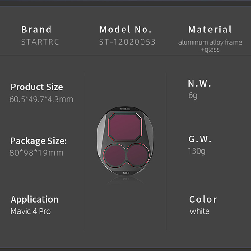 l Perfectly adapted to the Mavic 4 Pro, the ND filter with multi-layer coating is waterproof, scratch-proof, dust-proof and oil-proof, protecting your Mavic 4 Pro lens from all-around damage