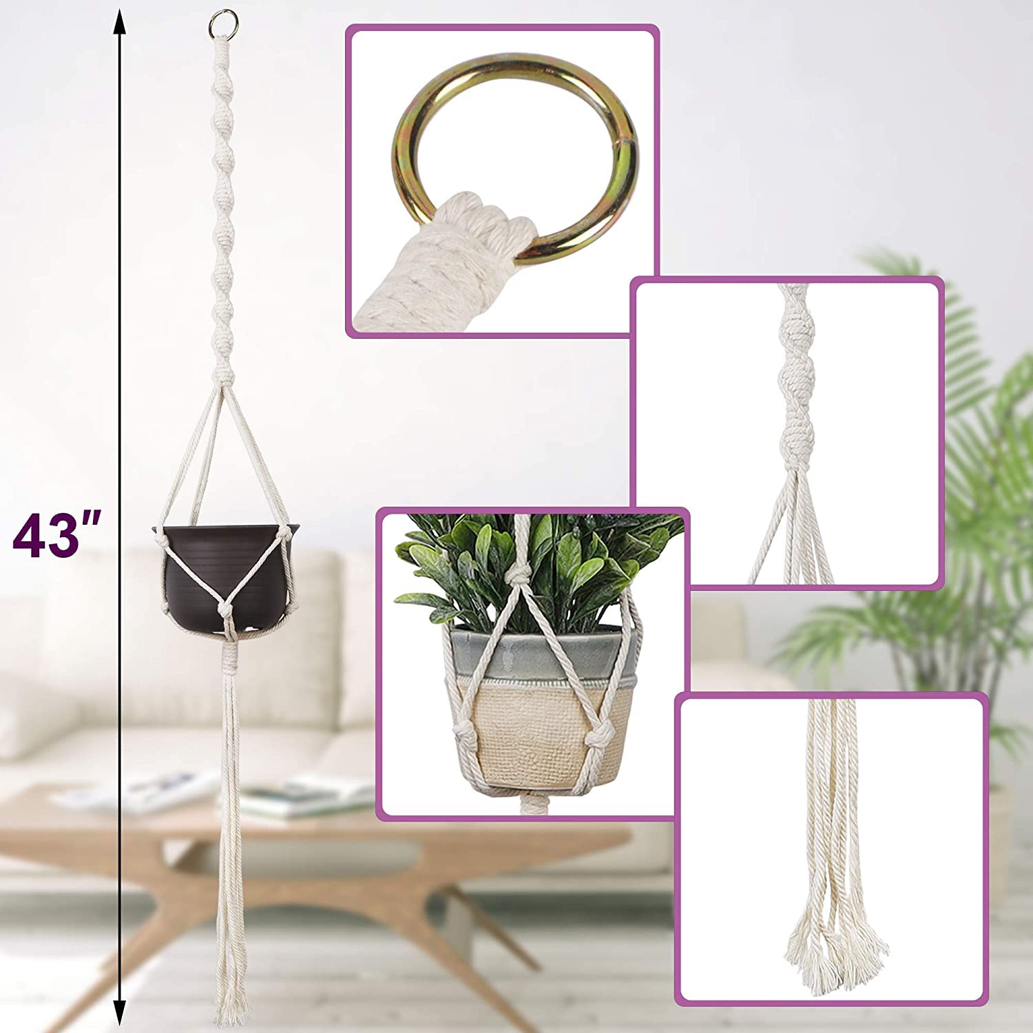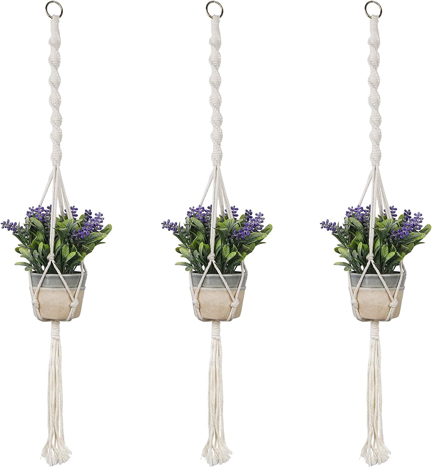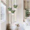 Add a natural, boho touch to your home or garden with this 3-pack of handmade macrame plant hangers. Crafted from 100% natural cotton rope and waterproof wood beads, these durable hanging baskets are designed to hold a wide variety of plant pots—ceramic, plastic, metal, or glass (pots not included). Perfect for indoor or outdoor use, each hanger measures approximately 43 inches long and comes with 6 hooks for flexible installation. Hang them from ceilings, walls, porches, or patios to save space and elevate your plant display. Ideal for decorating living rooms, kitchens, balconies, or office spaces, and a thoughtful gift for plant lovers on any occasion.