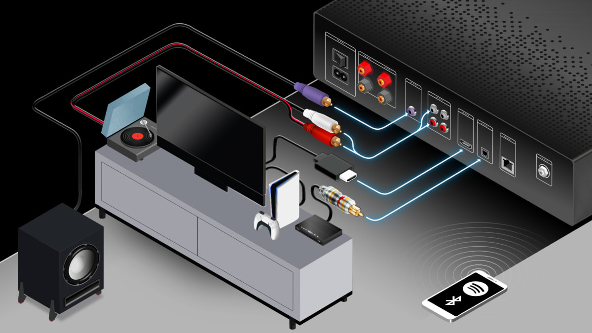 Über dein Smartphone spielst du Musik ganz einfach per Spotify Connect oder Bluetooth mit AAC ab.Du hast nur deine TV-Fernbedienung zur Hand? Kein Problem. Wenn dein TV-Gerät CEC-fähig ist, steuerst du mit der TV-Fernbedienung Lautstärke und Ein/Aus des Receivers.