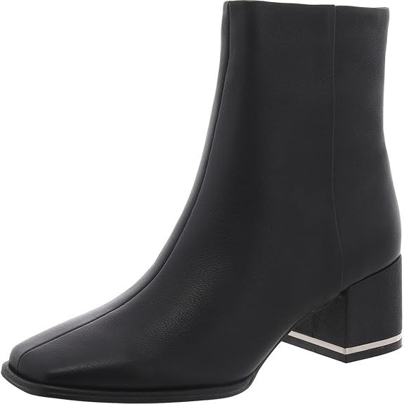 A squared-off toe and block heel with metallic rand bring intriguing geometries to this leather bootie furnished with a cushioned footbed.